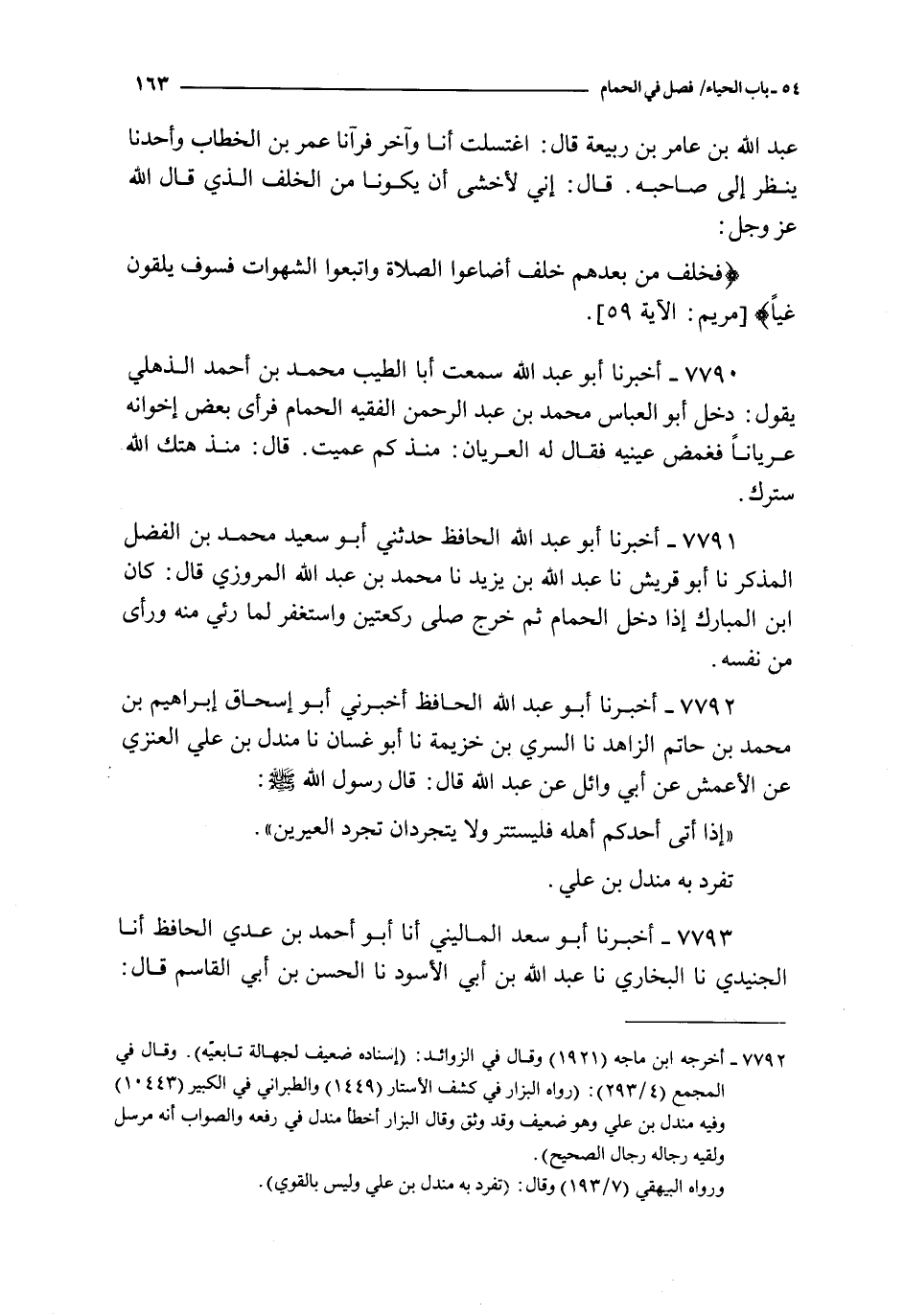7791 - أخبرنا أبو عبد الله الحافظ حدثني أبو سعيد محمد بن الفضل المذكر نا أبو قريش نا عبد الله بن يزيد نا محمد بن عبد الله المروزي قال : كان ابن المبارك إذا دخل الحمام ثم خرج صلى ركعتين و استغفر لما رئي منه و رأى من نفسه