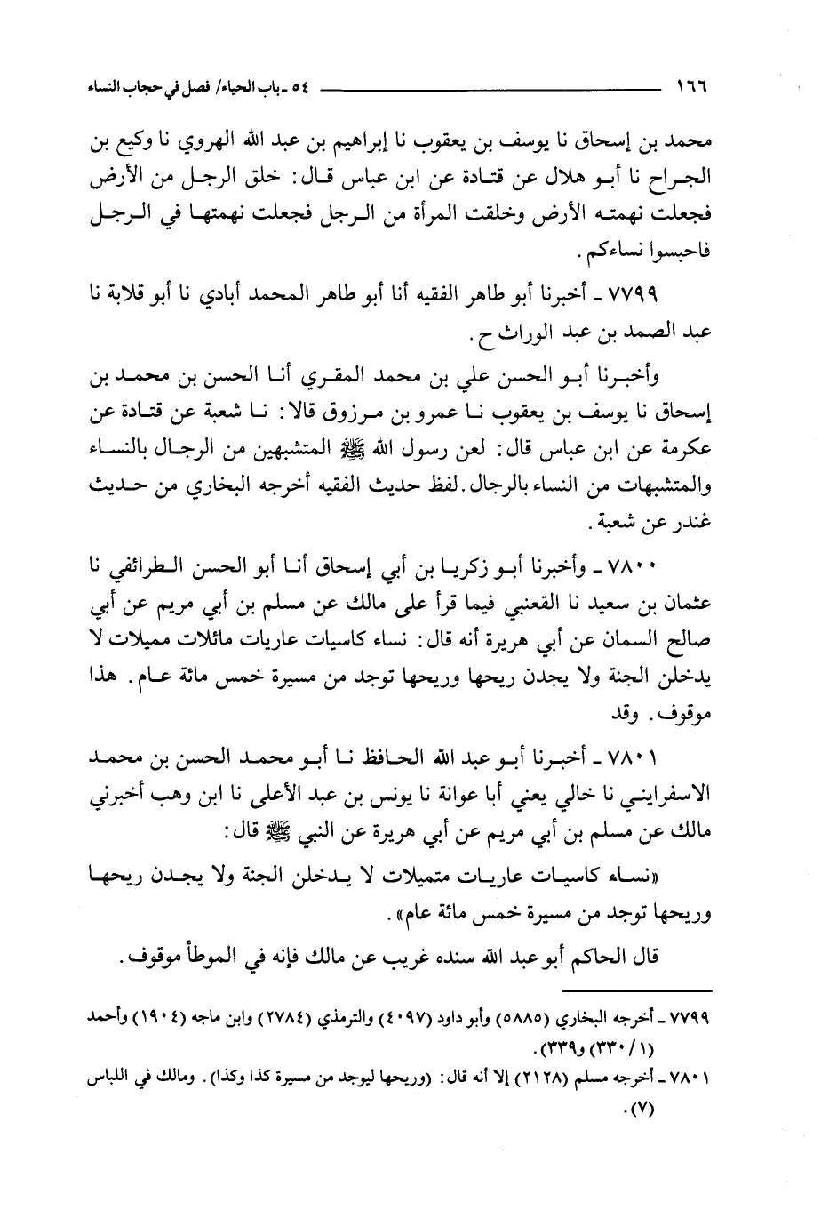 7800 - و أخبرنا أبو زكريا بن أبي إسحاق أنا أبو الحسن الطرائفي نا عثمان بن سعيد نا القعنبي فيما قرأ على مالك بن أبي مريم عن أبي صالح السمان عن أبي هريرة أنه قال : نساء كاسيات عاريات مائلات مميلات لا يدخلن الجنة و لا يجدن ريحها و ريحها توجد من ميسرة خمس مائة عام هذا موقوف و قد