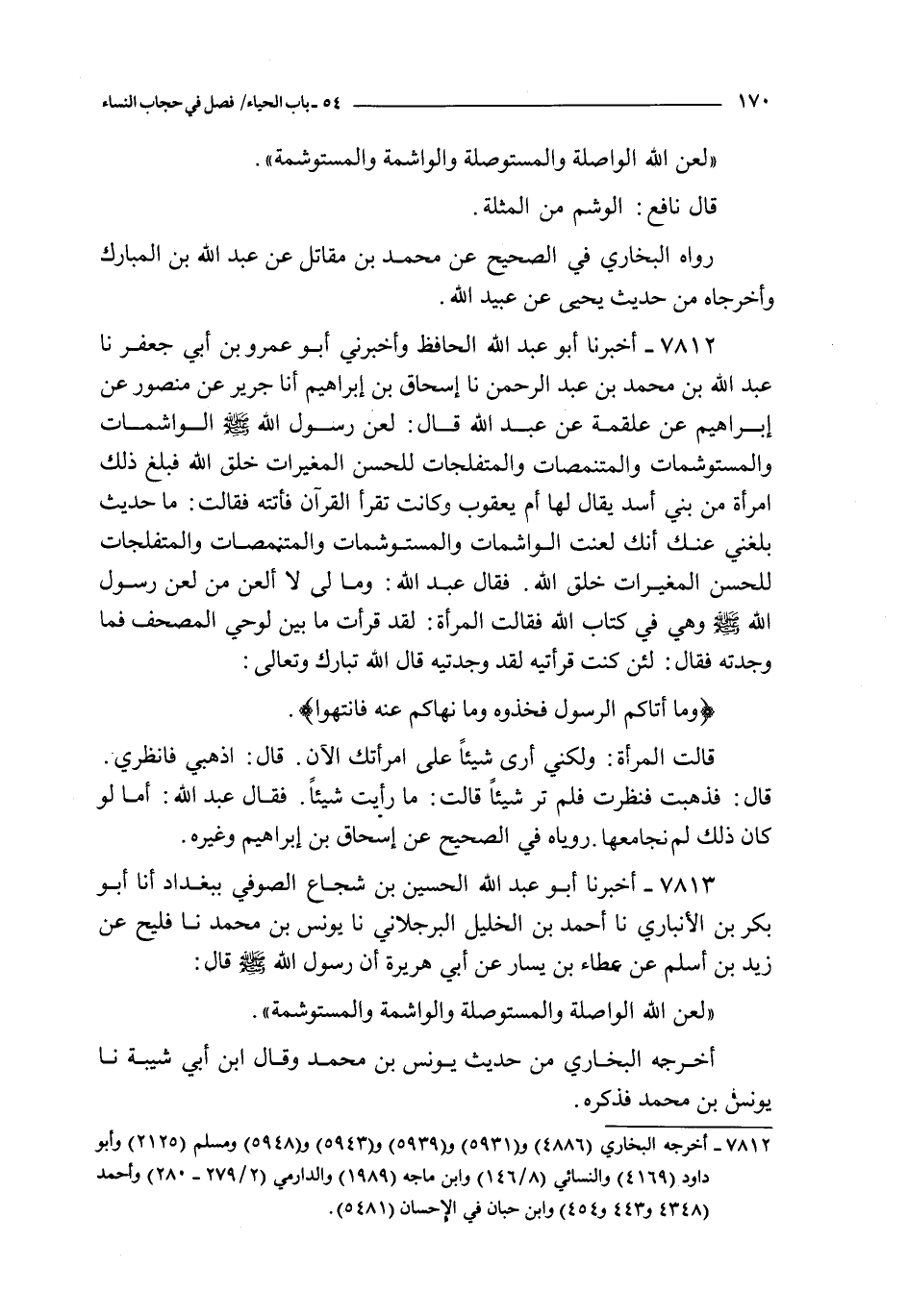 7812 - أخبرنا أبو عبد الله الحافظ و أخبرني أبو عمرو بن أبي جعفر نا عبد الله بن محمد بن عبد الرحمن نا إسحاق بن إبراهيم أنا جرير عن منصور عن إبراهيم عن علقمة عن عبد الله قال : لعن رسول الله صلى الله عليه و سلم الواشمات و المستوشمات و المتنمصات و المتفلجات للحسن المغيرات خلق الله فبلغ ذلك امرأة من بني أسد يقال لها أم يعقوب و كانت تقرأ القرآن فأتته فقالت : ما حديث بلغني عنك أنك لعنت الواشمات و المستوشمات و المتنمصات و المتفلجات للحسن المغيرات خلق الله فقال عبد الله : و ما لي لا ألعن من لعن رسول الله صلى الله عليه و سلم و هي في كتاب الله فقالت المرأة : لقد قرأت ما بين لوحي المصحف فما وجدته فقال : لئن كنت قرأتيه لقد وجدتيه قال الله تبارك و تعالى :