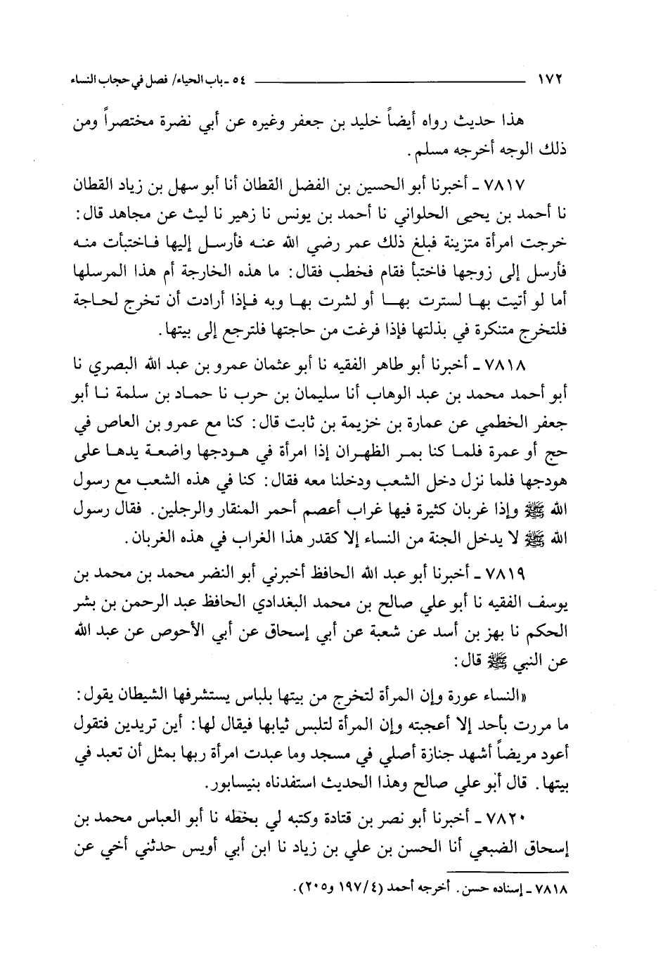 7818 - أخبرنا أبو طاهر الفقيه نا أبو عثمان عمرو بن عبد الله البصري نا أبو أحمد محمد بن عبد الوهاب أنا سليمان بن حرب نا حماد بن سلمة نا أبو جعفر الخطمي عن عمارة بن خزيمة بن ثابت قال : كنا مع عمرو بن العاص في حج أو عمرة فلما كنا بمر الظهران إذا امرأة في هودجها واضعة يدها على هودجها فلما نزل دخل الشعب و دخلنا معه فقال : كنا في هذه الشعب مع رسول الله صلى الله عليه و سلم و إذا غربان كثيرة فيها غراب أعصم أحمر المنقار و الرجلين فقال رسول الله صلى الله عليه و سلم لا يدخل الجنة من النساء إلا كقدر هذا الغراب في هذه الغربان