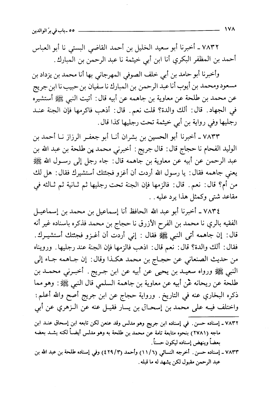 7833 - أخبرنا أبو الحسين بن بشران أنا أبو جعفر الرزاز نا أحمد بن الوليد الفحام نا حجاج قال : قال جريج : أخبرني محمد بن طلحة بن عبد الله بن عبد الرحمن عن أبيه عن معاوية بن جاهمه قال : جاء رجل إلى رسول الله صلى الله عليه و سلم يعني جاهمه فقال : يا رسول الله أردت أن أغزو فجئتك أستشيرك فقال : هل لك من أم ؟ قال : نعم قال : فالزمها فإن الجنة تحت رجليها ثم ثانية ثم ثالثه في مقاعد شتى و كمثل هذا يرد عليه