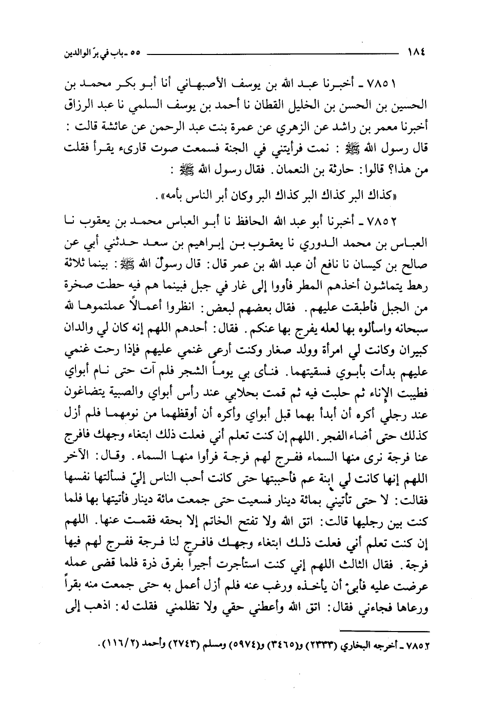 7852 - أخبرنا أبو عبد الله الحافظ نا أبو العباس محمد بن يعقوب نا العباس بن محمد الدوري نا يعقوب بن إبراهيم بن سعد حدثني أبي عن صالح بن كيسان نا نافع أن عبد الله بن عمر قال : قال رسول الله صلى الله عليه و سلم : بينما ثلاثة رهط يتماشون أخذهم المطر فأووا إلى غار في جبل فبينما هم فيه حطت صخرة من الجبل فأطبقت عليهم فقال بعضهم لبعض : انظروا أعمالا عملتموها لله سبحانه و اسألوه بها لعله يفرج بها عنكم فقال : أحدهم اللهم إنه كان لي والدان كبيران و كانت لي امرأة وولد صغار و كنت أرعى غنمي عليهم فإذا رحت غنمي عليهم بدأت بأبوي فسقيتهما فنأى بي يوما الشجر فلم آت حتى نام أبواي فطيبت الإناء ثم حلبت فيه ثم قمت بحلابي عند رأس أبواي و الصبية يتضاغون عند رجلي أكره أن أبدأ بهما قبل أبواي و أكره أن أوقظهما من نومهما فلم أزل كذلك حتى أضاء الفجر اللهم إن كنت تعلم أني فعلت ذلك ابتغاء وجهك فافرج عنا فرجة نرى منها السماء ففرج لهم فرجة فرأوا منها السماء وقال الآخر اللهم إنها كانت لي ابنة عم فأحببتها حتى كانت أحب الناس إلي فسألتها نفسها فقالت : لا حتى تأتيني بمائة دينار فسعيت حتى جمعت مائة دينار فأتيتها بها فلما كنت بين رجليها قالت : اتق الله و لا تفتح الخاتم إلا بحقه فقمت عنها اللهم إن كنت تعلم أني فعلت ذلك ابتغاء وجهك فافرج لنا فرجة ففرج لهم فيها فرجة فقال الثالث اللهم إني كنت استأجرت أجيرا بفرق ذرة فلما قضى عمله عرضت عليه فأبى أن يأخذه و رغب عنه فلم أزل أعمل به حتى جمعت منه بقرا و رعاها فجاءني فقال : اتق الله و أعطني حقي و لا تظلمني فقلت له : اذهب إلى تلك البقر و ارعها فخذها فقال اتق الله و لا تهزأ بي فقلت إني لا أهزأ بك فاذهب إلى تلك البقر و ارعها فخذها فاستاقها اللهم إن كنت تعلم أني فعلت ذلك ابتغاء وجهك فافرج عنا ما بقي منا ففرج الله عنهم فخرجوا يتماشون رواه مسلم في الصحيح عن زهير بن حرب و غيره عن يعقوب بن إبراهيم و أخرجاه من وجه آخر