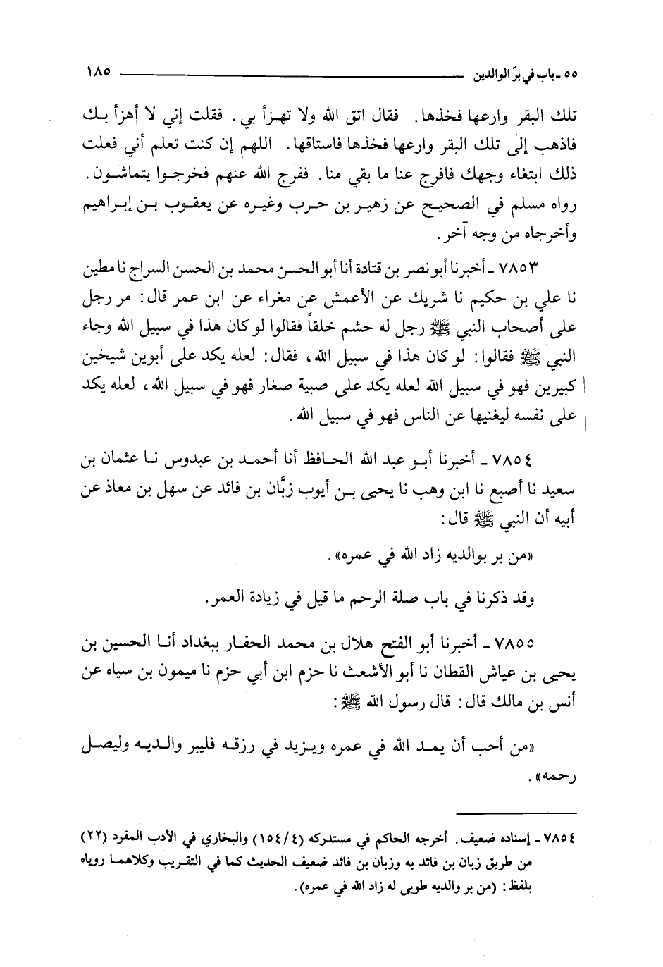 7853 - أخبرنا أبو نصر بن قتادة أنا أبو الحسن محمد بن الحسن السراج نا مطين نا علي بن حكيم نا شريك عن الأعمش عن مغراء عن ابن عمر قال : مر رجل على أصحاب النبي صلى الله عليه و سلم رجل له حشم خلقا فقالوا لو كان هذا في سبيل وجاء النبي صلى الله عليه و سلم فقالوا : لو كان هذا في سبيل الله فقال : لعله يكد على أبوين شيخين كبيرين فهو في سبيل الله لعله يكد على صبية صغار فهو في سبيل الله لعله يكد على نفسه ليغنيها عن الناس فهو في سبيل الله