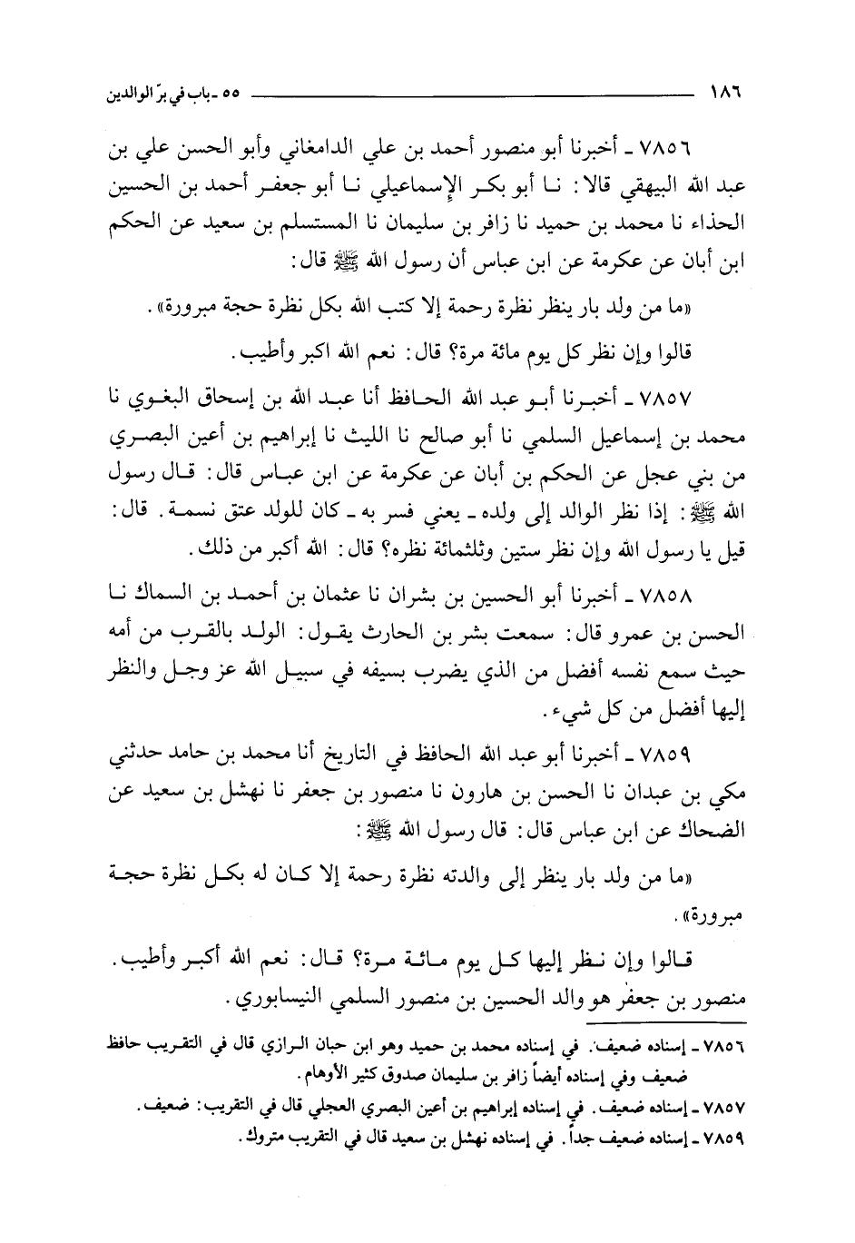 7857 - أخبرنا أبو عبد الله الحافظ أنا عبد الله بن إسحاق البغوي نا محمد بن إسماعيل السلمي نا أبو صالح نا الليث نا إبراهيم بن أعين البصري من بني عجل عن الحكم بن أبان عن عكرمة عن ابن عباس قال : قال رسول الله صلى الله عليه و سلم : إذا نظر الوالد إلى ولده ـ يعني فسر به ـ كان للولد عتق نسمة قال : قيل يا رسول الله و إن نظر ستين و ثلثمائة نظرة ؟ قال : الله أكبر من ذلك