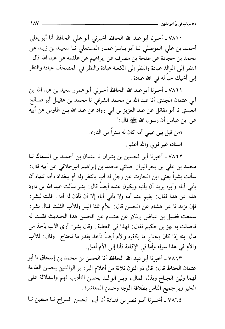 7860 - أخبرنا أبو عبد الله الحافظ أخبرني أبو علي الحافظ أنا أبو يعلى أحمد بن علي الموصلي نا أبو ياسر عمار المستملي نا سعيد بن زيد عن محمد بن جحادة عن طلحة بن مصرف عن إبراهيم عن علقمة عن عبد الله قال : النظر إلى الوالد عبادة و النظر إلى الكعبة عبادة و النظر في المصحف عبادة و النظر إلى أخيك حبا له في الله عبادة