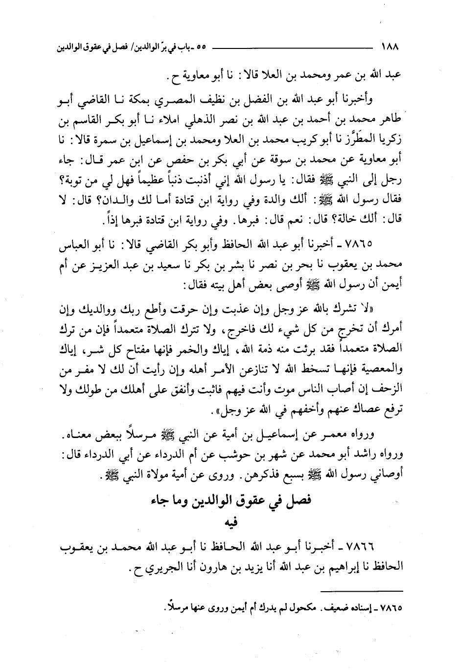 7865 - أخبرنا أبو عبد الله الحافظ و أبو بكر القاضي قالا : نا أبو العباس محمد بن يعقوب نا بحر بن نصر نا بشر بن بكر نا سعيد بن عبد العزيز عن أم أيمن : أن رسول الله صلى الله عليه و سلم أوصى بعض أهل بيته فقال :