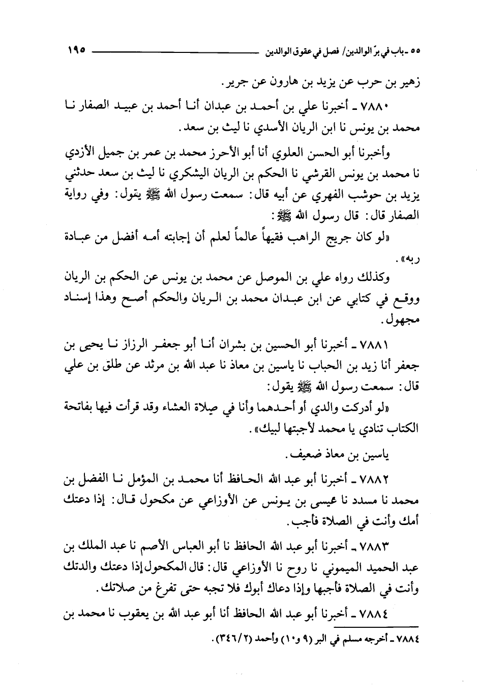 7882 - أخبرنا أبو عبد الله الحافظ أنا محمد بن المؤمل نا الفضل بن محمد نا مسدد نا عيسى بن يونس عن الأوزاعي عن مكحول قال : إذا دعتك أمك و أنت في الصلاة فأجب