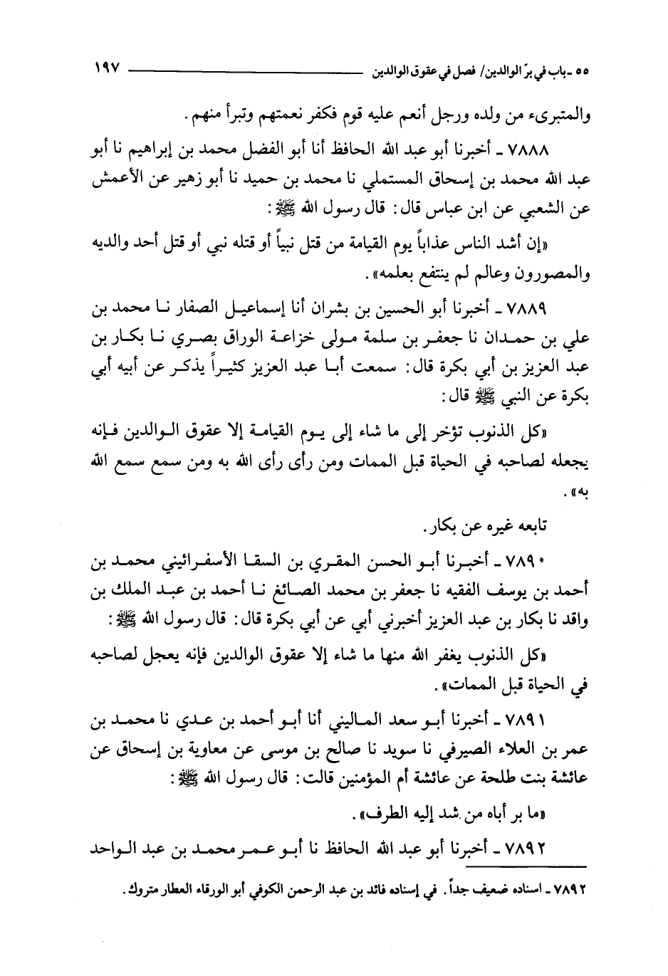 7892 - أخبرنا أبو عبد الله الحافظ نا أبو عمرو محمد بن عبد الواحد الزاهد صاحب ثعلب ببغداد نا موسى بن سهل الموسى نا يزيد بن هارون أنا فائد بن عبد الرحمن قال : سمعت عبد الله بن أبي أوفى قال : جاء رجل إلى النبي صلى الله عليه و سلم فقال : يا رسول الله إن ههنا غلاما قد احتضر يقال له قل : لا إله إلا الله فلا يستطيع أن يقولها قال : أليس قد كان يقولها في حياته ؟ قالوا : بلى قال : فما منعه منها عند موته قال : فنهض رسول الله صلى الله عليه و سلم و نهضنا معه حتى أتى الغلام فقال : يا غلام قل لا إله إلا الله قال : لا أستطيع أن أقولها قال : و لم ؟ قال : لعقوق والدتي قال : أحية هي ؟ قال : نعم قال : أرسلوا إليها فأرسلوا إليها فجاءت فقال لها رسول الله صلى الله عليه و سلم : ابنك هو ؟ قالت : نعم قال : أرأيت لو أن نارا أججت فقيل لك إن لم تشفعي له قذفناه في هذه النار قالت : إذا كنت أشفع له قال : فاشهدي الله و اشهدينا معك بأنك قد رضيت قالت : قد رضيت عن ابني قال : يا غلام قل لا إله إلا الله فقال : لا إله إلا الله فقال : رسول الله صلى الله عليه و سلم الحمد لله الذي أنقذه من النار