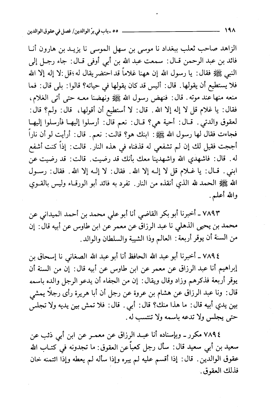 7894 - أخبرنا أبو عبد الله الحافظ أنا أبو عبد الله الصغاني نا إسحاق بن إبراهيم أنا عبد الرزاق عن معمر عن ابن طاوس عن أبيه قال : إن من السنة أن يوقر أربعة فذكرهم وزاد و قال و يقال : إن من الجفاء أن يدعو الرجل والده باسمه قال : و نا عبد الرزاق عن هشام بن عروة عن رجل أن أبا هريرة رأى رجلا يمشي بين يدي أبيه قال : ما هذا منك ؟ قال : أبي قال : فلا تمش بيد يديه و لا تجلس حتى يجلس و لا تدعه باسمه و لا تنتسب له