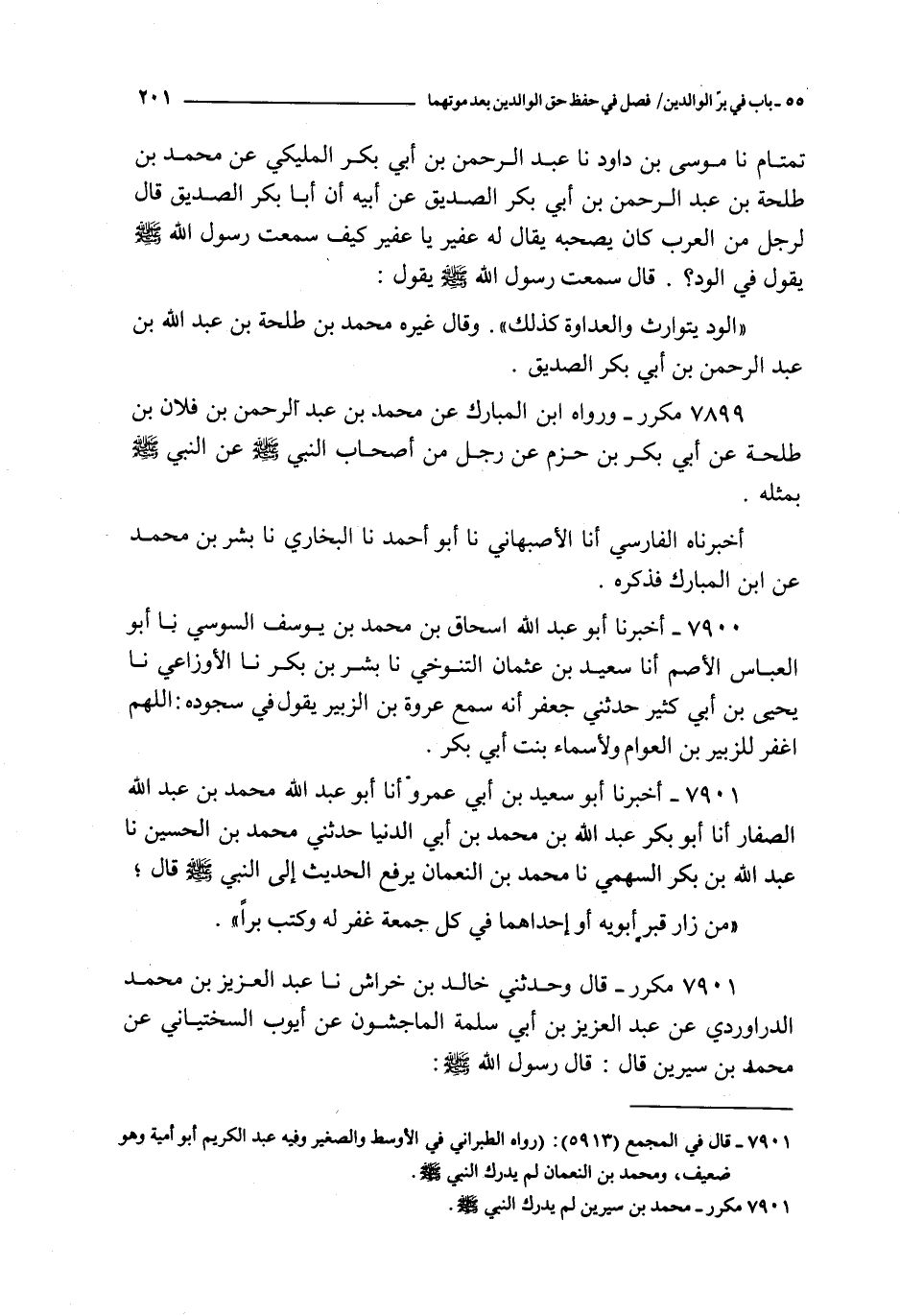 7901 - أخبرنا أبو سعيد بن أبي عمرو أنا أبو عبد الله محمد بن عبد الله الصفار أنا أبو بكر عبد الله بن محمد بن أبي الدنيا حدثني محمد بن الحسين نا عبد الله بن بكر السهمي نا محمد بن النعمان : يرفع الحديث إلى النبي صلى الله عليه و سلم قال :