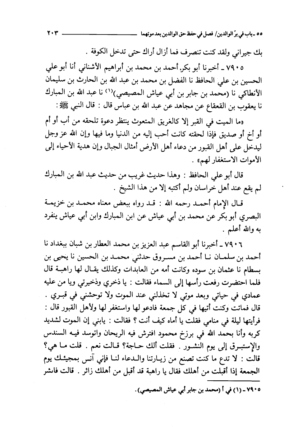 7906 - أخبرنا أبو القاسم عبد العزيز بن محمد العطار بن شبان ببغداد نا أحمد بن سلمان نا أحمد بن مسروق حدثني محمد بن الحسين نا يحيى بن بسطام نا عثمان بن سوده : و كانت أمه من العابدات و كذلك يقال لها راهبة قال فلما احتضرت رفعت رأسها إلى السماء فقالت : يا ذخري و ذخيرتي و يا من عليه عمادي في حياتي و بعد موتي لا تخذلني عند الموت و لا توحشني في قبري قال فماتت و كنت أتيها في كل جمعة فادعو لها و استغفر لها و لأهل القبور قال : فرأيتها ليلة في منامي فقلت يا أماه كيف أنت ؟ فقالت : يا بني إن الموت لشديد كربه و أنا بحمد الله في برزخ محمود افترش فيه الريحان و أتوسد فيه السندس و الإستبرق إلى يوم النشور فقلت ألك حاجة ؟ قالت نعم قلت ما هي ؟ قالت : لا تدع ما كنت تصنع من زيارتنا و الدعاء لنا فإني آنس بمجيئك يوم الجمعة إذا أقبلت من أهلك فقال يا راهبة قد أقبل من أهلك زائر قالت فابشر و بشر بذلك من حولي من الأموات