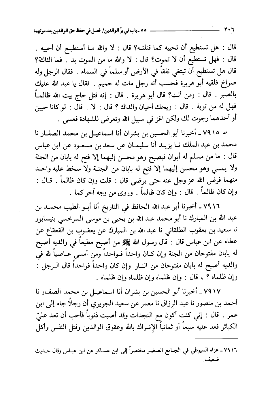7915 - أخبرنا أبو الحسين بن بشران أنا إسماعيل بن محمد الصفار نا محمد بن عبد الملك نا يزيد أنا سليمان عن سعد بن مسعود عن ابن عباس قال : ما من مسلم له أبوان فيصبح و هو محسن إليهما إلا فتح له بابان من الجنة و لا يمسي و هو محسن إليهما إلا فتح له بابان من الجنة و لا سخط عليه واحد منهما فرض الله عز و جل عنه حتى يرضى قال : قلت و إن كان ظالما قال : و إن كان ظالما قال : و إن كان ظالما و روى من وجه آخر كما
