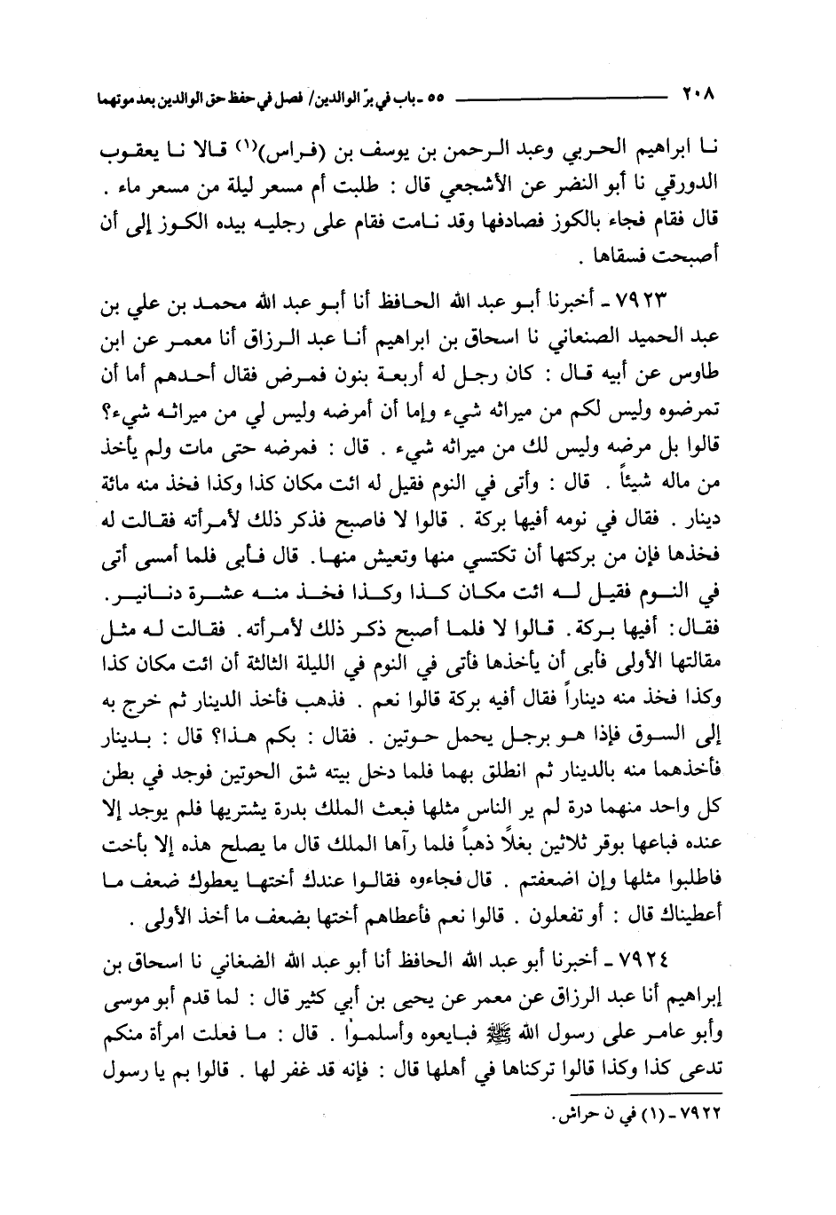 7923 - أخبرنا أبو عبد الله الحافظ أنا أبو عبد الله محمد بن علي بن عبد الحميد الصنعاني نا إسحاق بن إبراهيم أنا عبد الرزاق أنا معمر عن ابن طاوس عن أبيه قال : كان رجل له أربعة بنون فمرض فقال أحدهم أما أن تمرضوه و ليس لكم من ميراثه شيء و إما أن أمرضه و ليس لي من ميراثه شيء ؟ قالوا بل مرضه و ليس لك من ميراثه شيء قال : فمرضه حتى مات ولم يأخذ من ماله شيئا قال : و أتى في النوم فقيل له ائت مكان كذا و كذا فخذ منه مائة دينار فقال في نومه أفيها بركة قالوا لا فأصبح فذكر ذلك لامرأته فقالت له فخذها فإن من بركتها أن تكتسي منها و تعيش منها قال فأبى فلما أمسى أتى في النوم فقيل له ائت مكان كذا و كذا فخذ منه عشرة دنانير فقال : أفيها بركة قالوا لا فلما أصبح ذكر ذلك لامرأته فقالت له مثل مقالتها الأولى فأبى أن يأخذها فأتى في النوم في الليلة الثالثة أن ائت مكان كذا و كذا فخذ منه دينارا فقال أفيه بركة فقال قالوا نعم فذهب فأخذ الدينار ثم خرج به إلى السوق فإذا هو برجل يحمل حوتين فقال : بكم هذا ؟ قال : بدينار فأخذهما منه بالدينار ثم انطلق بهما فلما دخل بيته شق الحوتين فوجد في بطن كل واحد منهما درة لم ير الناس مثلها فبعث الملك بدرة يشتريها فلم يوجد إلا عنده فباعها بوقر ثلاثين بغلا ذهبا فلما رآها الملك ما يصلح هذه إلا بأخت فاطلبوا مثلها و إن أضعفتم قال فجاءوه فقالوا عندك أختها يعطوك ضعف ما أعطيناك قال : أو تفعلون قال نعم فأعطاهم أختها بضعف ما أخذ الأولى