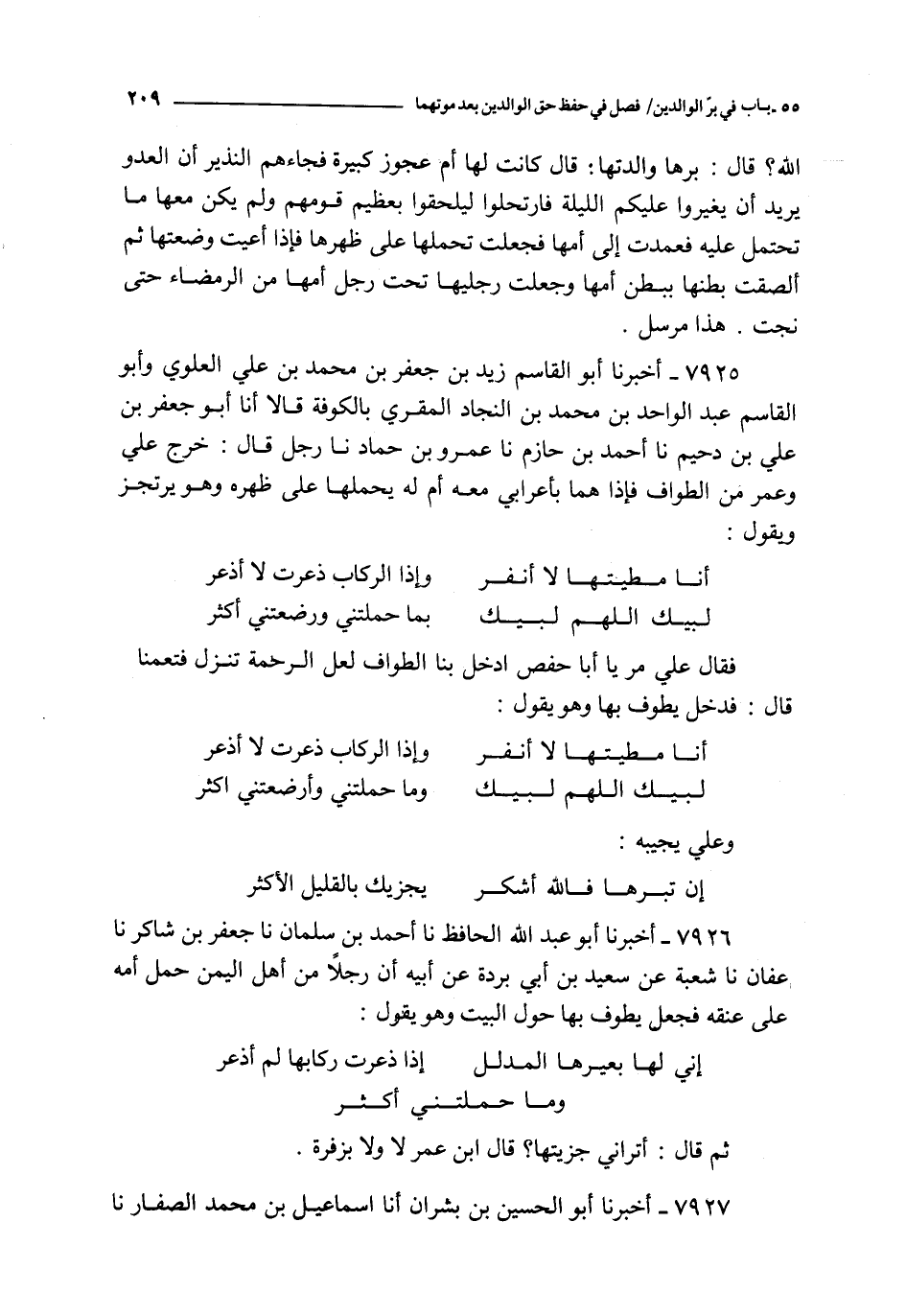 7926 - أخبرنا أبو عبد الله الحافظ تا أحمد بن سلمان نا جعفر بن شاكر نا عفان نا شعبة عن سعيد بن أبي بردة عن أبيه : أن رجلا من أهل اليمن حمل أمه على عنقه فجعل يطوف بها حول البيت وهو يقول :