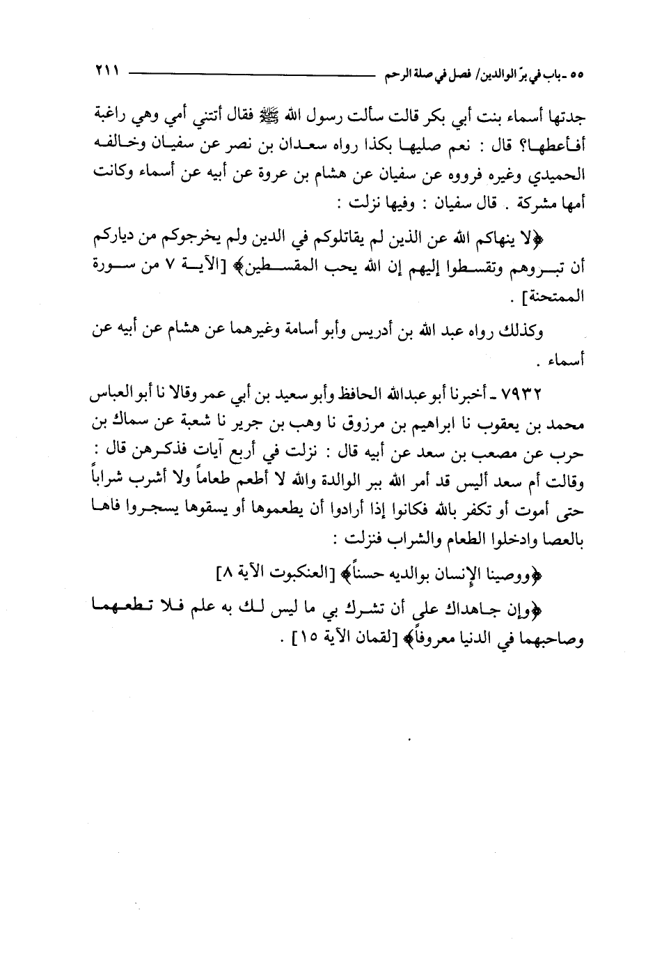 7932 - أخبرنا أبو عبد الله الحافظ و أبو سعيد بن أبي عمرو و قالا نا أبو العباس محمد بن يعقوب نا إبراهيم بن مرزوق نا وهب بن جرير نا شعبة عن سماك بن حرب عن مصعب بن سعد عن أبيه قال : نزلت في أربع آيات فذكرهن قال : و قالت أم سعد أليس قد أمر الله ببر الوالدة و الله لا أطعم طعاما و لا أشرب شرابا حتى أموت أو أتكفر بالله فكانوا إذا أرادوا أن يطعموها أو يسقوها يسجروا فاها بالعصا و ادخلوا الطعام و الشراب فنزلت