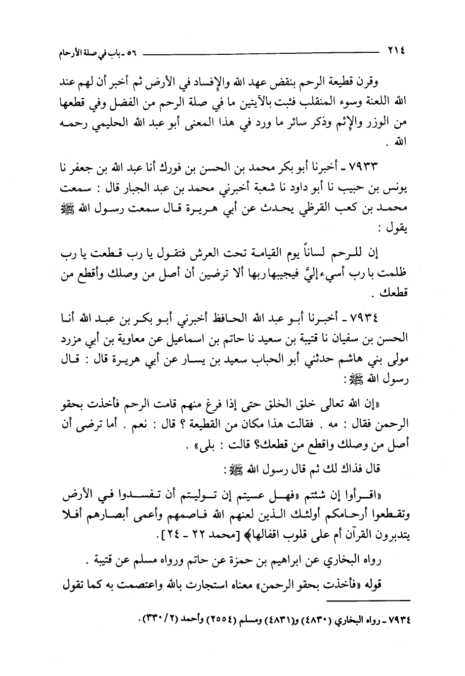 السادس و الخمسون من شعب الإيمان و هو باب في صلة الأرحام ـ قال الله تعالى : { فهل عسيتم إن توليتم أن تفسدوا في الأرض وتقطعوا أرحامكم } ـ فجعل قطع الأرحام من الإفساد في الأرض ثم اتبع ذلك الإخبار بأن ذلك من فعل من حقت عليه لعنته فسلبه الانتفاع بسمعه و بصره فهو يسمع دعوة الله و يبصر آياته و بيناته فلا يجب الدعوة و لا ينقاد للحق كأنه لم يسمع النداء و لم يقع له من الله البيان و جعله كالبهيمة أو أسوء حالا منها فقال : { أولئك الذين لعنهم الله فأصمهم وأعمى أبصارهم } و قال في الواصل و القاطع : { يتذكر أولو الألباب * الذين يوفون بعهد الله ولا ينقضون الميثاق * والذين يصلون ما أمر الله به أن يوصل ويخشون ربهم ويخافون سوء الحساب * والذين صبروا ابتغاء وجه ربهم وأقاموا الصلاة وأنفقوا مما رزقناهم سرا وعلانية ويدرؤون بالحسنة السيئة أولئك لهم عقبى الدار * جنات عدن يدخلونها } إلى آخرها { والذين ينقضون عهد الله من بعد ميثاقه ويقطعون ما أمر الله به أن يوصل ويفسدون في الأرض أولئك لهم اللعنة ولهم سوء الدار } فقرن وصل الرحم و هو الذي أمر الله به أن يوصل بخشيته و الحوف من حسابه و الصبر عن محارمه و إقام الصلاة و إيتاء الزكاة لوجهه و جعل ذلك كله من فعل أولي الألباب ثم وعد به الجنة و زيارة الملائكة إياهم فيها و تسليمهم عليه و مدحهم له و قرن قطيعة الرحم بنقض عهد الله و الإفساد في الأرض ثم أخبر أن لهم عند الله اللعنة و سوء المنقلب فثبت بالآيتين ما في صلة الرحم من الفضل و في قطعها من الوزر و الإثم و ذكر سائر ما ورد في هذا المعنى أبو عبد الله الحليمي رحمه الله
