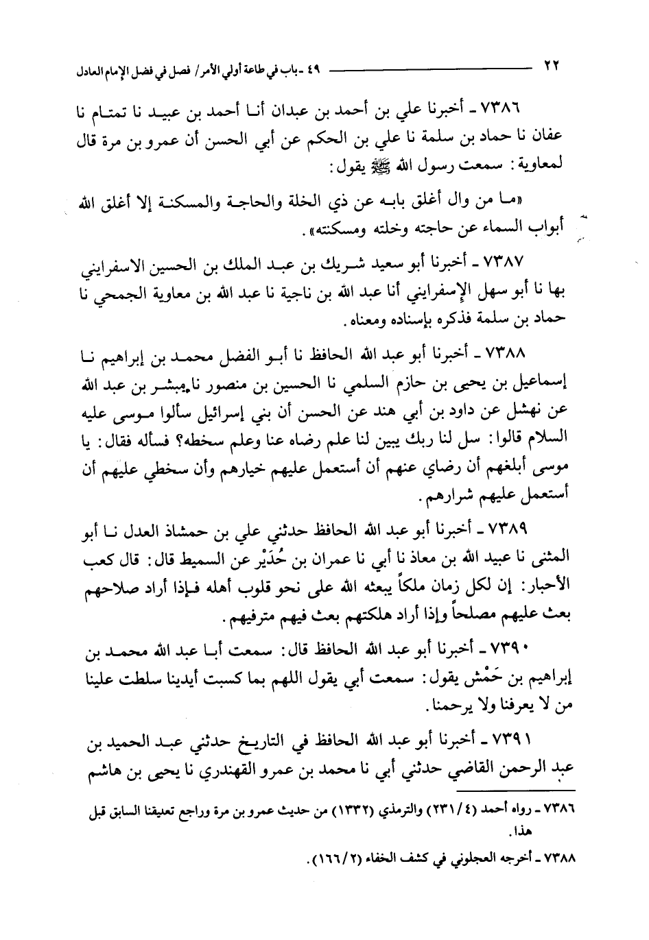 7387 - أخبرنا أبو سعيد شريك بن عبد الملك بن الحسين الاسفرايني بها نا أبو سهل الاسفرايني أنا عبد الله بن ناجية نا عبد الله بن معاوية الجمحي نا حماد بن سلمة : فذكره بإسناده و معناه