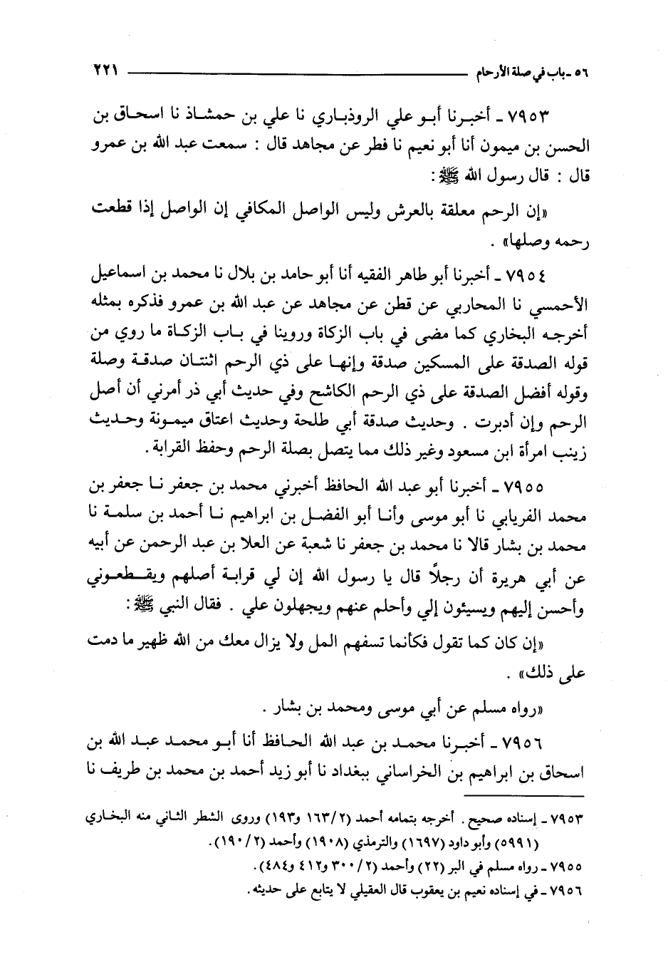 7954 - أخبرنا أبو طاهر الفقيه أنا أبو حامد بن بلال نا محمد بن إسماعيل الأحمسي نا المحاربي عن قطن عن مجاهد عن مجاهد عن عبد الله بن عمرو : فذكره بمثله أخرجه البخاري كما مضى في باب الزكاة و روينا في باب الزكاة ما روي من قوله الصدقة على المسكين صدقة و إنها على ذي الرحم اثنتان صدقة و صلة و قوله أفضل الصدقة على ذي الرحم الكاشح و في حديث أبي ذر أمرني أن أصل الرحم و إن أدبرت و حديث صدقة أبي طلحة و حديث اعتاق ميمونة و حديث زينب امرأة ابن مسعود و غير ذلك مما يتصل بصلة الرحم و حفظ القرابة