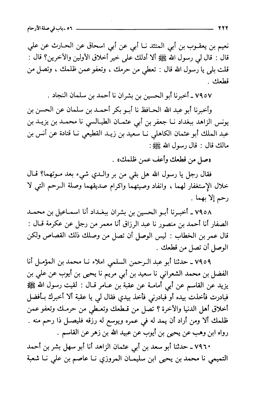 7958 - أخبرنا أبو الحسين بن بشران ببغداد أنا إسماعيل بن محمد الصفار أنا أحمد بن منصور نا عبد الرزاق أنا معمر من رجل عن عكرمة قال : قال عمر بن الخطاب : ليس الوصل أن تصل من وصلك ذلك القصاص و لكن الوصل أن تصل من قطعك