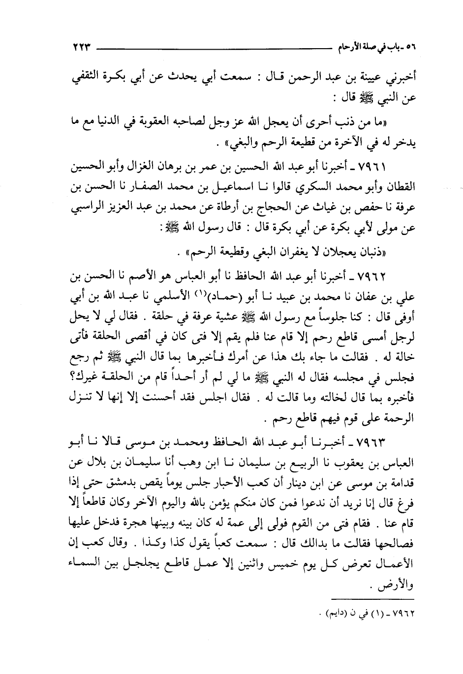 7962 - أخبرنا أبو عبد الله الحافظ نا أبو العباس هو الأصم نا الحسن بن علي بن عفان نا محمد بن عبيد نا أبو حماد الأسلمي نا عبد الله بن أبي أوفى قال : كنا جلوسا مع رسول الله صلى الله عليه و سلم عشية عرفة في حلقة فقال لي لا يحل لرجل أمسى قاطع رحم إلا قام عنا فلم يقم إلا فتى كان في أقصى الحلقة فأتى خالة له فقالت ما جاء بك هذا عن أمرك فأخبرها بما قال النبي صلى الله عليه و سلم ثم رجع فجلس في مجلسه فقال له النبي صلى الله عليه و سلم ما لي لم أر أحدا قام من الحلقة غيرك الرحمة على قوم فيهم قاطع رحم
