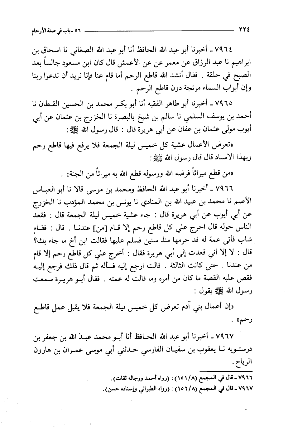 7966 - أخبرنا أبو عبد الله الحافظ و محمد بن موسى قالا نا أبو العباس الأصم نا محمد بن عبيد الله بن المنادي نا يونس بن محمد المؤدب نا الخزرج عن أبي أيوب عن أبي هريرة قال : جاء عشية خميس ليلة الجمعة قال : فقعد الناس حوله قال احرج علي كل قاطع رحم إلا قام من عندنا قال : فقام شاب فأتى عمة له قد حرمها منذ سنين فسلم عليها فقالت ابن أخ ما جاء بك ؟ قال : لا إني قعدت إلى أبي هريرة فقال : أخرج علي كل قاطع رحم إلا قام من عندنا حتى كانت الثالثة قالت ارجع إليه فسأله ثم قال ذلك فرجع إليه فقص عليه القصة ما كان من أمره و ما قالت له عمته فقال أبو هريرة سمعت رسول الله صلى الله عليه و سلم يقول :
