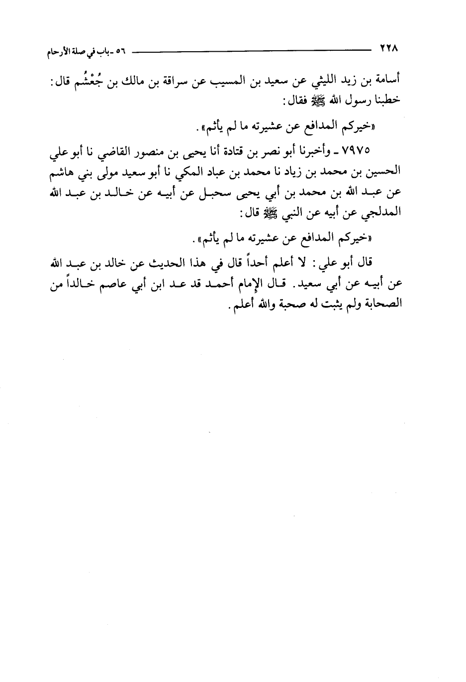 قال أبو علي : لا أعلم أحدا قال في هذا الحديث عن خالد بن عبد الله عن أبيه عن أبي سعيد قال الإمام أحمد قد عد ابن أبي عاصم خالدا من الصحابة و لم يثبت له صحابة و لم يثبت له صحبة و الله أعلم