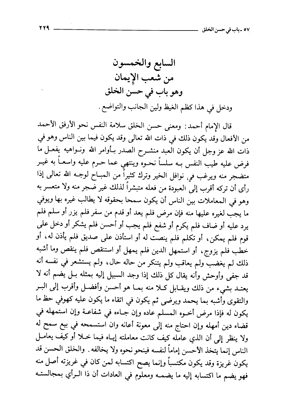 السابع والخسمون من شعب الإيمان و هو باب في حسن الخلق ـ و دخل في هذا كظم الغيط و لين الجانب و التواضع قال الإمام أحمد : و معنى حسن الخلق سلامة النفس نحو الأرفق الأحمد من الأفعال و قد يكون ذلك في ذات الله تعالى و قد يكون فيما بين الناس و هو في ذات الله عز و جل أن يكون العبد منشرح الصدر بأوامر الله و نواهيه يفعل ما فرض عليه طيب النفس به سلسا نحوه و ينتهي عما حرم عليه واسعا به غير متضجر منه و يرغب في نوافل الخير و ترك كثيرا من المباح لوجه الله تعالى إذا رأى أن تركه أقرب إلى العبودة من فعله متبشرا لذلك غير ضجر منه و لا متعسر به و هو في المعاملات بين الناس أن يكون سمحا بحقوقه لا يطالب غيره بها ويوفي ما يجب لغيره عليها منه فإن مرض فلم يعد أو قدم من سفر فلم يزر أو سلم فلم يرد عليه أو ضاف فلم يكرم أو شفع فلم يجب أو أحسن فلم يشكر أو دخل على قوم فلم يمكن أو تكلم فلم ينصت له أو استأذن على صديق فلم يأذن له أو خطب فلم يزوج أو استهمل الدين فلم يمهل أو استنقص فلم ينقص و ما أشبه ذلك لم يغضب و لم يعاقب و لم يتنكر من حاله حال و لم يستشعر في نفسه أنه قد جفى و أوحش و أنه يقال كل ذلك إذا وجد السبيل إليه بمثله بل يضم أنه لا يعتد بشيء من ذلك و يقابل كلا منه بما هو أحسن و أفضل و أقرب إلى البر و التقوى و أشبه بما يحمد و يرضى ثم يكون في إتقاء ما يكون عليه كهوفي حظ ما يكون له فإذا مرض أخوه المسلم عاده و إن جاءه في شفاعة و إن استمهله في قضاء دين أمهله و إن احتاج منه إلى معونة أعانه و إن استسمحه في بيع سمح له و لا ينظر إلى أن الذي عامله كيف كانت معاملته إياه فيما خلا أو كيف يعامل الناس إنما يتخذ الأحسن إماما لنفسه فينحو نحوه و لا يخالفه و الخلق الحسن قد يكون غريزة وقد يكون مكتسبا و إنما يصح اكتسابه لمن كان في غريزته أصل منه فهو يضم ما اكتسابه إليه ما يضمه و معلوم في العادات أن ذا الرأي بمجالسته أولى الأحلام و النهي رأيا و إن العالم يزداد بمخالطة العلماء علما و كذلك الصالح و العاقل بمجالسة الصلحاء و العقلاء فلا ينكر أن يكون ذو الخلق الجميل يزداد حسن الخلق بمجالسة أولى الأخلاق الحسنة و بالله التوفيق