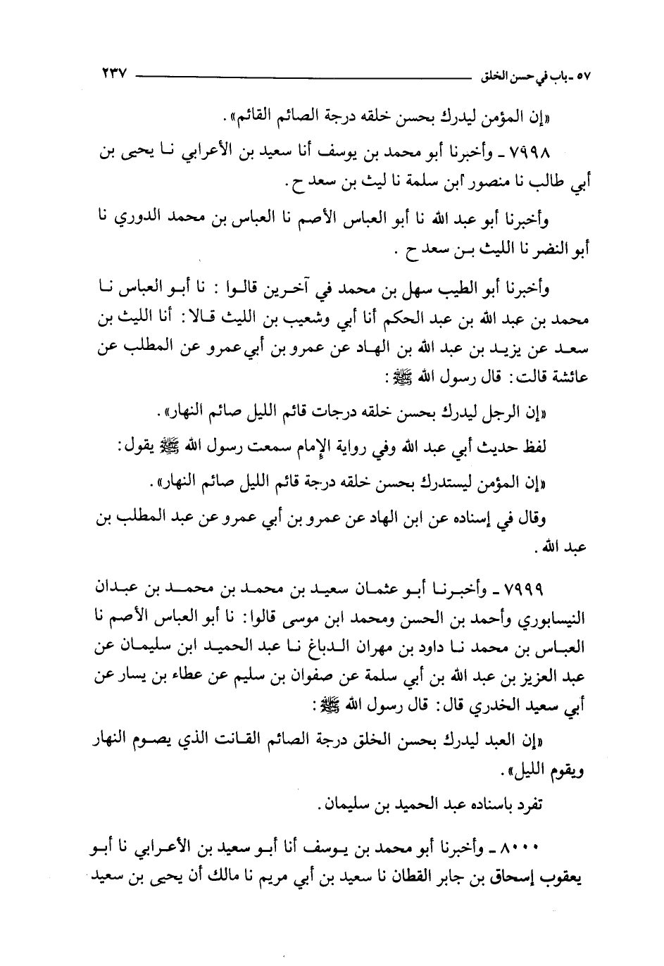 8000 - و أخبرنا أبو محمد بن يوسف أنا أبو سعيد بن الأعرابي نا أبو يعقوب إسحاق بن جابر القطان نا سعيد بن أبي مريم نا مالك أن يحيى بن سعيد حدثه قال : بلغني إن المرء ليدرك بحسن خلقه درجة القائم بالليل الظامي بالسواحر و روى أيضا عن محمد بن يحيى بن حبان عن أبي هريرة عن النبي صلى الله عليه و سلم