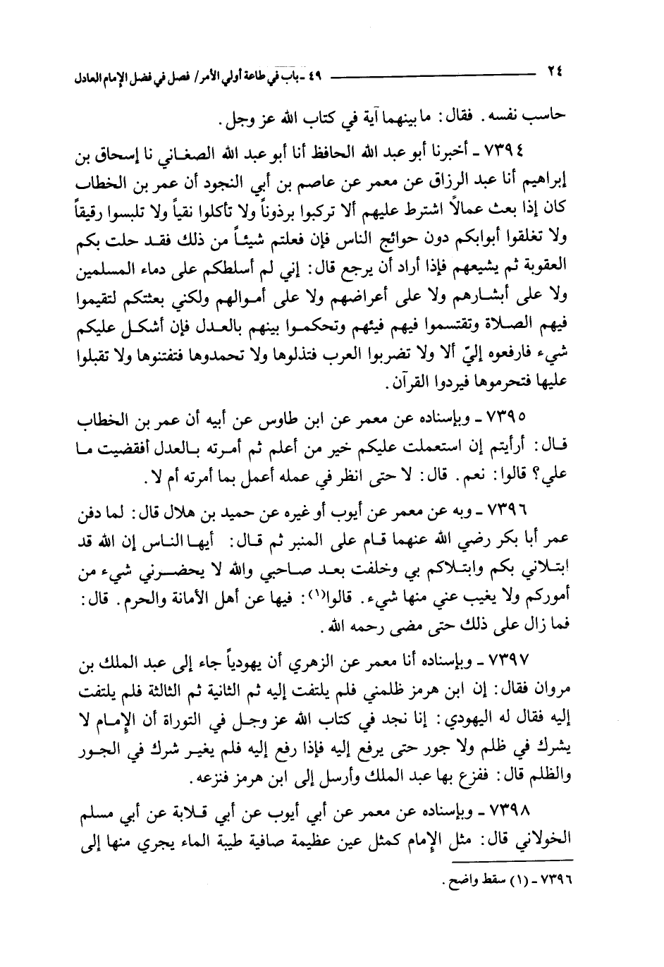 7397 - و بإسناده أنا معمر عن الزهري : أن يهوديا جاء إلى عبد الملك بن مروان فقال : إن ابن هرمز ظلمني فلم يلتف إليه ثم الثانية ثم الثالثة فلم يلتفت إليه فقال له اليهودي : إنا نجد في كتاب الله عز و جل في التوراة أن الإمام لا يشرك في ظلم و لا جور حتى يرفع إليه فإذا رفع إليه فلم يغير شرك في الجور و الظلم قال : ففزع بها عبد الملك و أرسل إلى ابن هرمز فنزعه