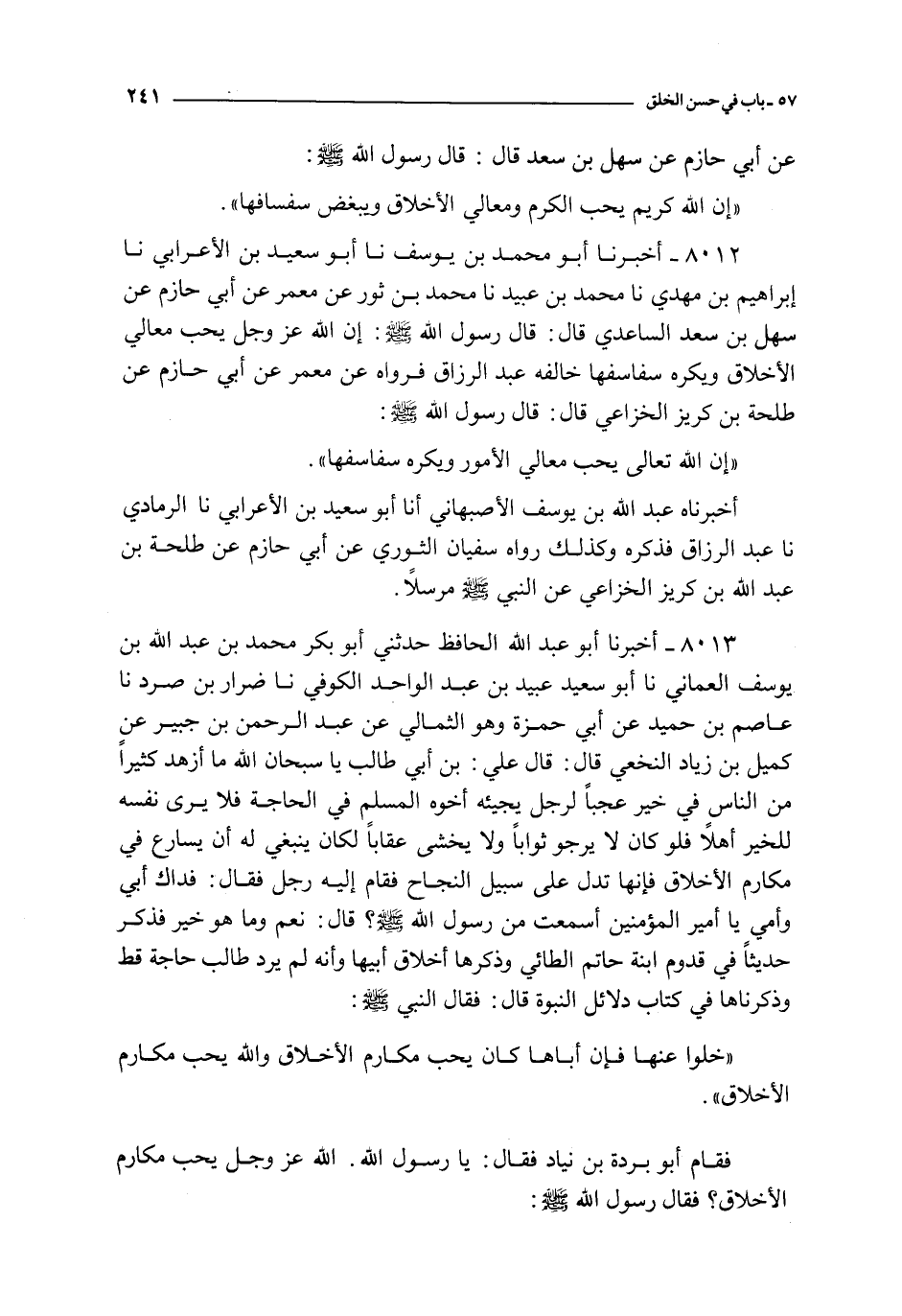 8012 - أخبرنا أبو محمد بن يوسف نا أبو سعيد بن الأعرابي نا إبراهيم بن مهدي نا محمد بن عبيد نا محمد بن ثور عن معمر عن أبي حازم عن سهل بن سعد الساعدي قال : قال رسول الله صلى الله عليه و سلم : إن الله عز و جل يحب معالي الأخلاق و يكره سفاسفها خالفه عبد الرزاق فرواه عن معمر عن أبي حازم عن طلحة بن كريز الخزاعي قال :