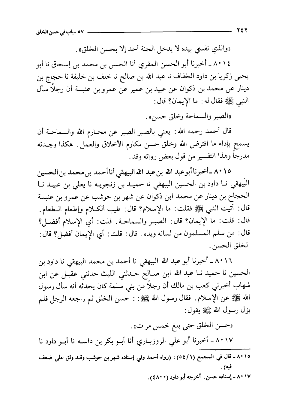 قال أحمد رحمه الله : يعني بالصبر الصبر على محارم الله و السماحة أن يسمح بإداء ما افترض الله و خلق مكارم الأخلاق و العمل هكذا وجدته مدرجا و هذا التفسير من قوله بعض رواته و قد
