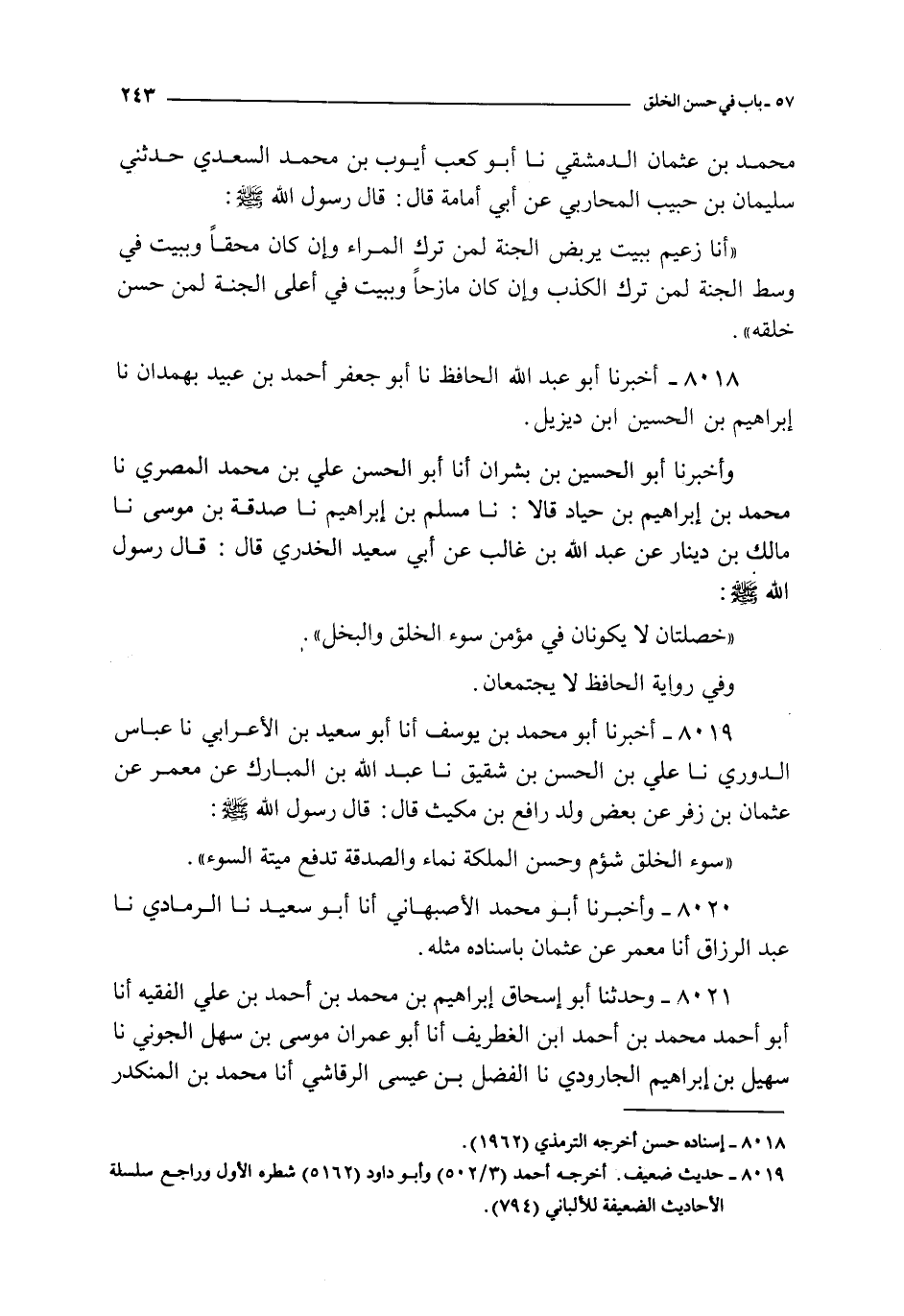 8019 - أخبرنا أبو محمد بن يوسف أنا أبو سعيد بن الأعرابي نا عباس الدوري نا علي بن الحسن بن شقيق نا عبد الله بن المبارك عن معمر عن عثمان بن زفر عن بعض ولد رافع بن مكيث قال : قال رسول الله صلى الله عليه و سلم :
