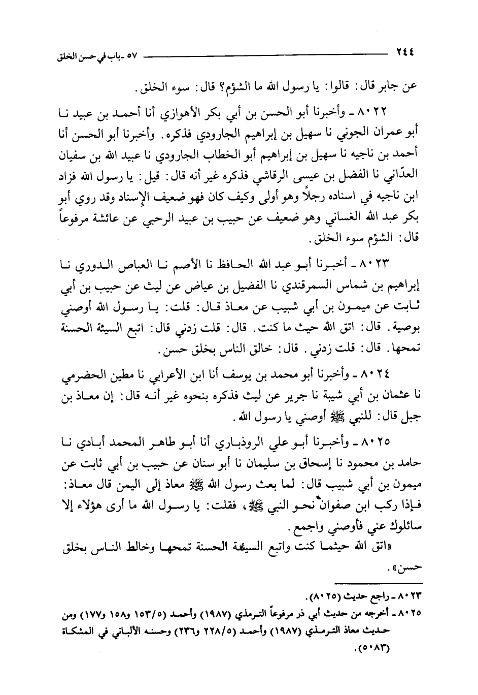 8024 - و أخبرنا أبو محمد بن يوسف أنا ابن الأعرابي نا مطين الحضرمي نا عثمان بن أبي شيبة نا جرير عن ليث : فذكره بنحوه غير أنه قال : إن معاذ بن جبل قال : للنبي صلى الله عليه و سلم أوصني يا رسول الله
