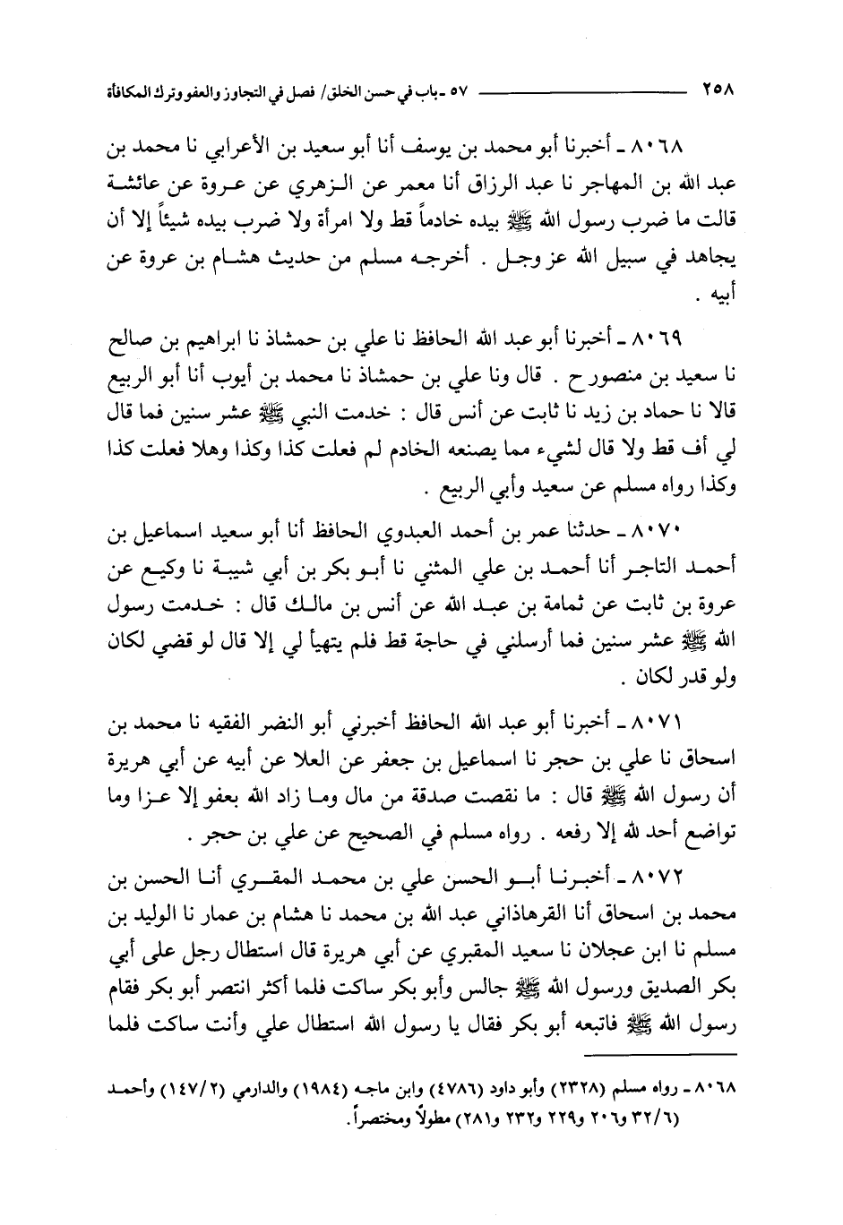 8068 - أخبرنا أبو محمد بن يوسف أنا أبو سعيد بن الأعرابي نا محمد بن عبد الله بن المهاجر نا عبد الرزاق أنا معمر عن الزهري عن عروة عن عائشة قالت : ما ضرب رسول الله صلى الله عليه و سلم بيده خادما قط و لا امرأة و لا ضرب بيده شيئا إلا أن يجاهد في سبيل الله عز و جل أخرجه مسلم من حديث هشام بن عروة عن أبيه