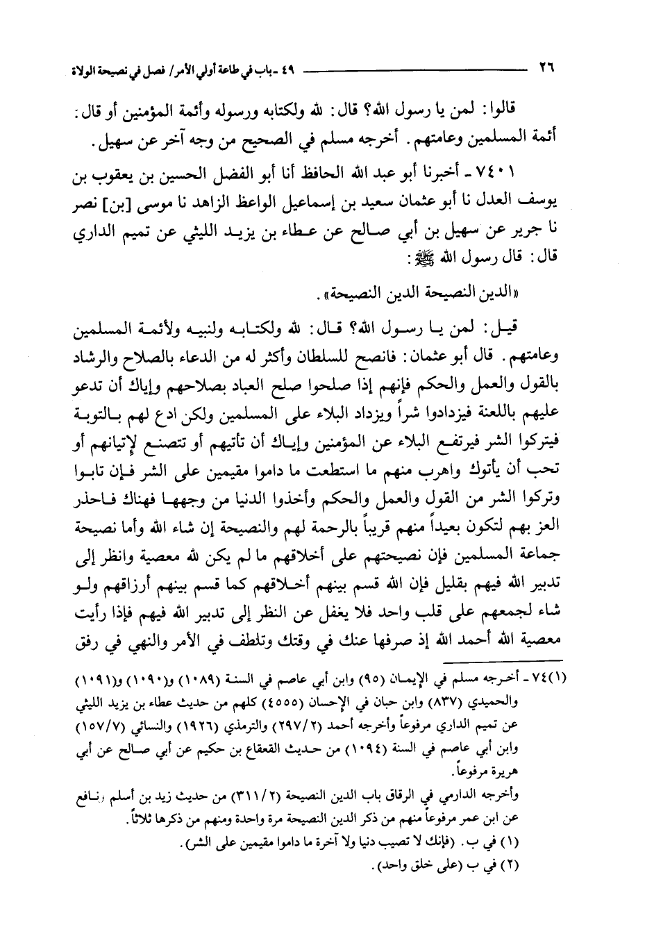 قيل : لمن يا رسول الله ؟ قال : لله و لكتابه و لنبيه و لأئمة المسلمين و عامتهم قال أبو عثمان : فانصح للسلطان و أكثر له من الدعاء بالصلاح و الرشاد بالقول و العمل و الحكم فإنهم إذا صلحوا صلح العباد بصلاحهم و إياك أن تدعو عليهم باللعنة فيزدادوا شرا و يزداد البلاء على المسلمين و لكن ادع لهم بالتوبة فيتركة الشر فيرتفع البلاء عن المؤمنين و إياك أن تأتيهم أو تتصنع لإتيانهم أو تحب أن يأتوك و اهرب منهم ما استطعت ما داموا مقيمين على الشر فإن تابوا و تركوا الشر من القوم و العمل و الحكمة و أخذوا الدنيا من وجهها فهناك فاحذر العز بهم لتكون بعيدا منهم قريبا بالرحمة لهم و النصيحة إن شاء الله و أما نصيحة جماعة المسلمين فإن نصيحتهم على أخلاقهم ما لم يكن لله معصية و انظر إلى تدبير الله فيهم بقليل فإن الله قسم بينهم أخلاقهم كما قسم بينهم أرزاقهم و لو شاء لجمعهم على قلب واحد فلا يغفل عن النظر إلى تدبير الله فيهم فإذا رأيت معصية الله أحمد الله إذ صرفها عنك في وقتك و تلطف في الأمر و النهي في رفق و صبر و سكينة فإن قبل منم فاحمد الله و إن رد عليك فاستغفر الله لتقصير منك كان في أمرك و نهيك و اصبر على ما أصابك إن ذلك من عزم الأمور