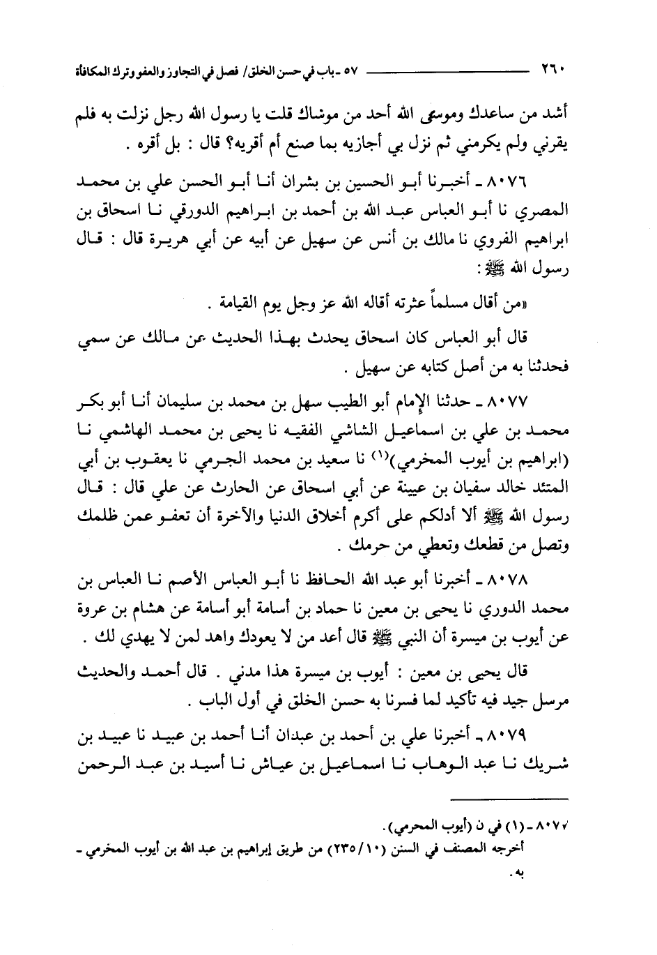 8077 - حدثنا الإمام أبو الطيب سهل بن محمد بن سليمان أنا أبو بكر محمد بن علي بن إسماعيل الشاشي الفقيه نا يحيى بن محمد الهاشمي نا إبراهيم بن أيوب المخرمي نا سعيد بن محمد الجرمي نا يعقوب بن أبي المتئد خالد سفيان بن عيينة عن أبي إسحاق عن الحارث عن علي قال : قال رسول الله صلى الله عليه و سلم ألا أدلكم على أكرم أخلاق الدنيا و الآخرة أن تعفو عمن ظلمك و تصل من قطعك و تعطي من حرمك