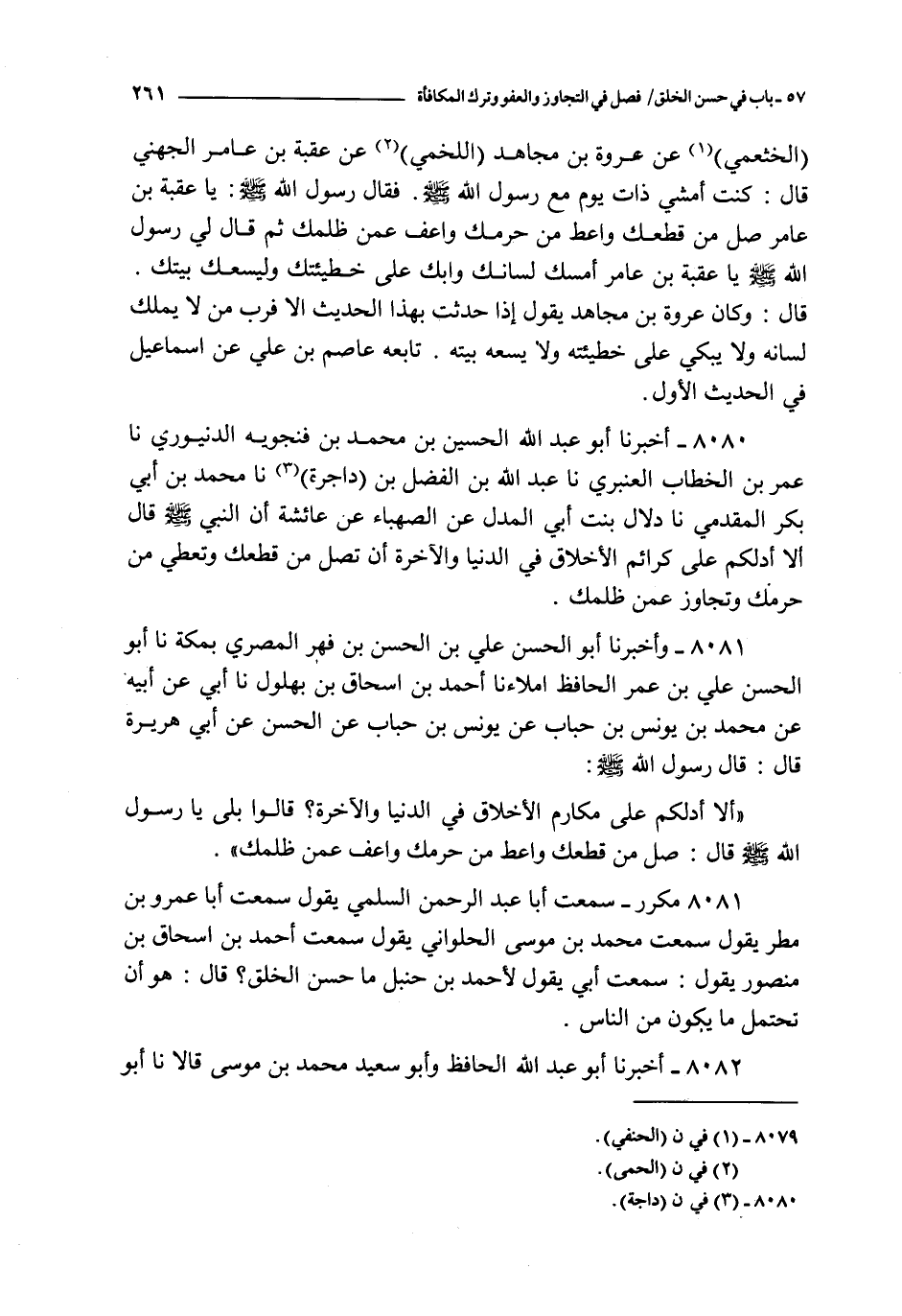 8081 - مكرر ـ سمعت أبا عبد الرحمن السلمي يقول سمعت أبا عمرو بن مطر يقول سمعت محمد بن موسى الحلواني يقول سمعت أحمد بن إسحاق بن منصور يقول : سمعت أبي يقول لأحمد بن حنبل : ما حسن الخلق ؟ قال : هو أن تحتمل ما يكون من الناس