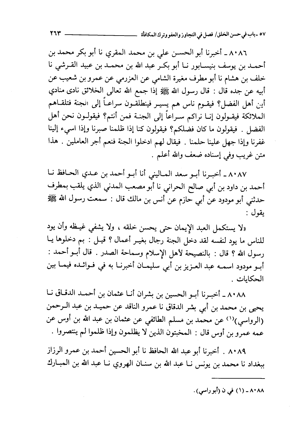 8088 - أخبرنا أبو الحسين بن بشران أنا عثمان بن أحمد الدقاق نا يحيى بن محمد بن أبي بشر الدقاق نا عمرو الناقد عن حميد بن عبد الرحمن الرواسي عن محمد بن مسلم الطائفي عن عثمان بن عبد الله بن أوس عن عمه عمرو بن أوس قال : المخبتون الذين لا يظلمون و إذا ظلموا لم ينتصروا