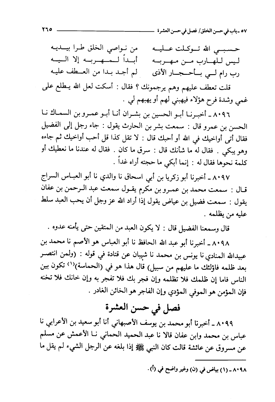 8096 - أخبرنا أبو الحسين بن بشران أنا أبو عمرو بن السماك نا الحسن بن عمرو قال : سمعت بشر بن الحارث يقول : جاء رجل إلى الفضيل فقال أتى أواخيك في الله أو أحبك قال : لا تقل كذا قل أحب أواخيك ثم جاءه و هو يبكي فقال له ما شأنك قال : سرق ما كان فقال له عندنا ما نعطيك أو كلمة نحوها فقال له : إنما أبكي ما حجته أراه غدا