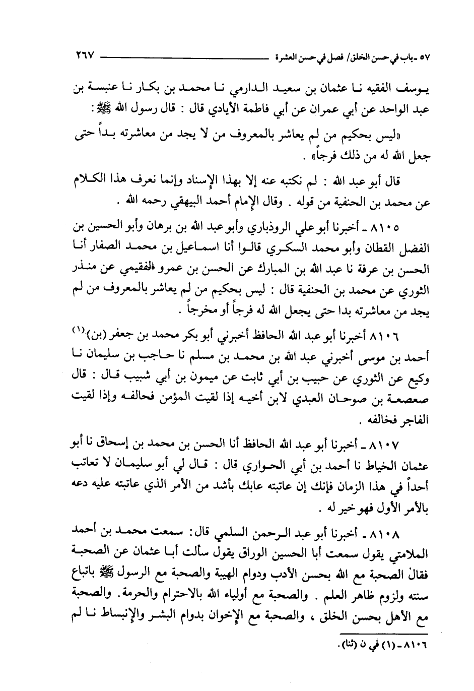 8108 - أخبرنا أبو عبد الرحمن السلمي قال : سمعت محمد بن أحمد الملامتي يقول سمعت أبا الحسين الوراق يقول : سألت أبا عثمان عن الصحبة فقال الصحبة مع الله بحسن الأدب و دوام الهيبة و الصحبة مع الرسول صلى الله عليه و سلم باتباع سنته و لزوم ظاهر العلم و الصحبة مع أولياء الله بالاحترام و الحرمة و الصحبة مع الأهل بحسن الخلق و الصحبة مع الإخوان بدوام البشر و الإنبساط نا لم يكن إثما و الصحبة مع الجهال بالدعاء لهم و الرحمة عليهم و رؤية نعمة الله عليك أنه لم يبتلك بما أبلاهم به