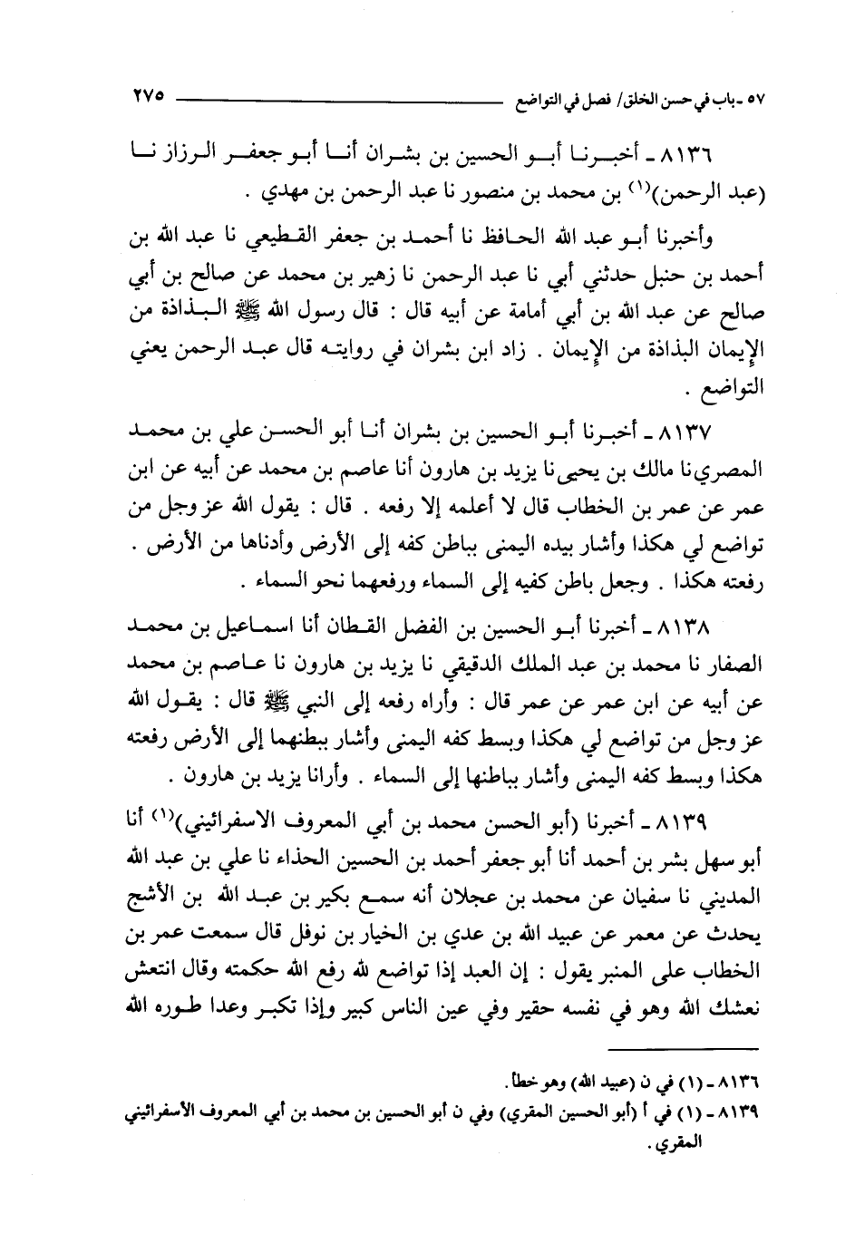 8138 - أخبرنا أبو الحسين بن الفضل القطان أنا إسماعيل بن محمد الصفار نا محمد بن عبد الملك الدقيقي نا يزيد بن هارون نا عاصم بن محمد عن أبيه عن ابن عمر عن عمر قال : و أراه رفعه إلى النبي صلى الله عليه و سلم قال : يقول الله عز و جل من تواضع لي هكذا و بسط كفه اليمنى و أشار ببطنها إلى الأرض رفعته هكذا و بسط كفه اليمنى و أشار بباطنها إلى السماء و أرانا يزيد بن هارون