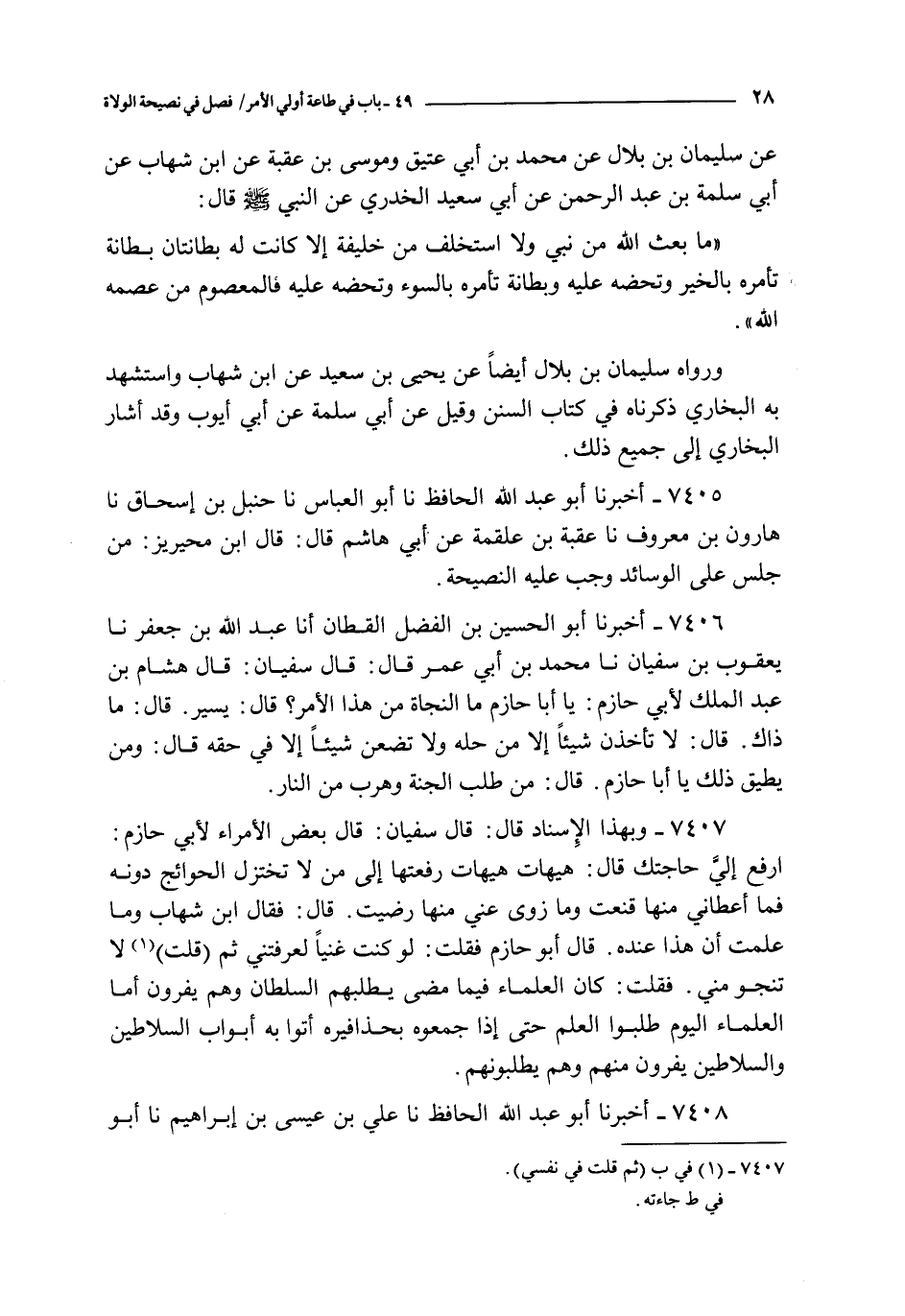 7407 - و بهذا الإسناد قال : قال سفيان : قال بعض الأمراء لأبي حازم : ارفع إلي حاجتك قال : هيهات هيهات رفعتها إلى من لا تختزل الحوائج دونه فلما أعطاني منها قنعت و ما زوى عني منها رضيت قال : فقال ابن شهاب و ما علمت أن هذا عنده قال أبو حازم فقلت لو كنت غنيا لعرفتني ثم قلت لا تنجو مني فقلت : لو كنت غنيا لعرفتني ثم قلت لا تنجو مني فقلت : كان العلماء فيما مضى يطلبهم السلطان و هم يفرون أما العلماء اليوم طلبوا العلم حتى إذا جمعوه بحذافيره أتوا به أبواب السلاطين و السلاطين يفرون منهم و هم يطلبونهم