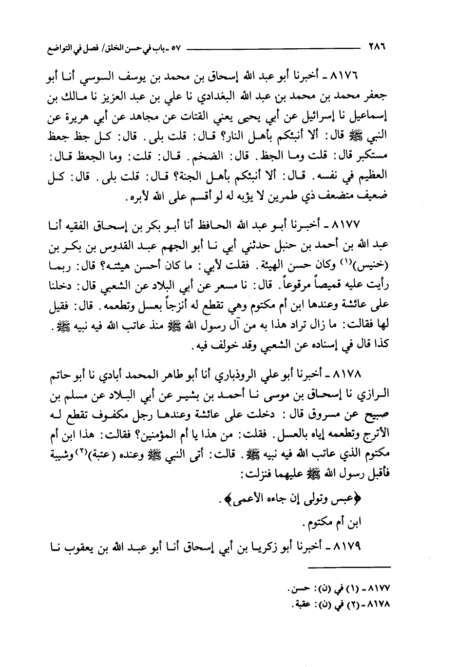 8178 - أخبرنا أبو علي الروذباري أنا أبو طاهر المحمد أبادي نا أبو حاتم الرازي نا إسحاق بن موسى نا أحمد بن بشير عن أبي البلاد عن مسلم بن صبيح عن مسروق قال : دخلت على عائشة و عندها رجل مكفوف تقطع له الأترج و تطعمه إياه بالعسل فقلت : من هذا يا أم المؤمنين ؟ فقالت : هذا ابن أبي مكتوم الذي عاتب الله فيه نبيه صلى الله عليه و سلم قالت : أتى النبي صلى الله عليه و سلم و عنده عتبة و شيبة فأقبل رسول الله صلى الله عليه و سلم عليهما فنزلت :