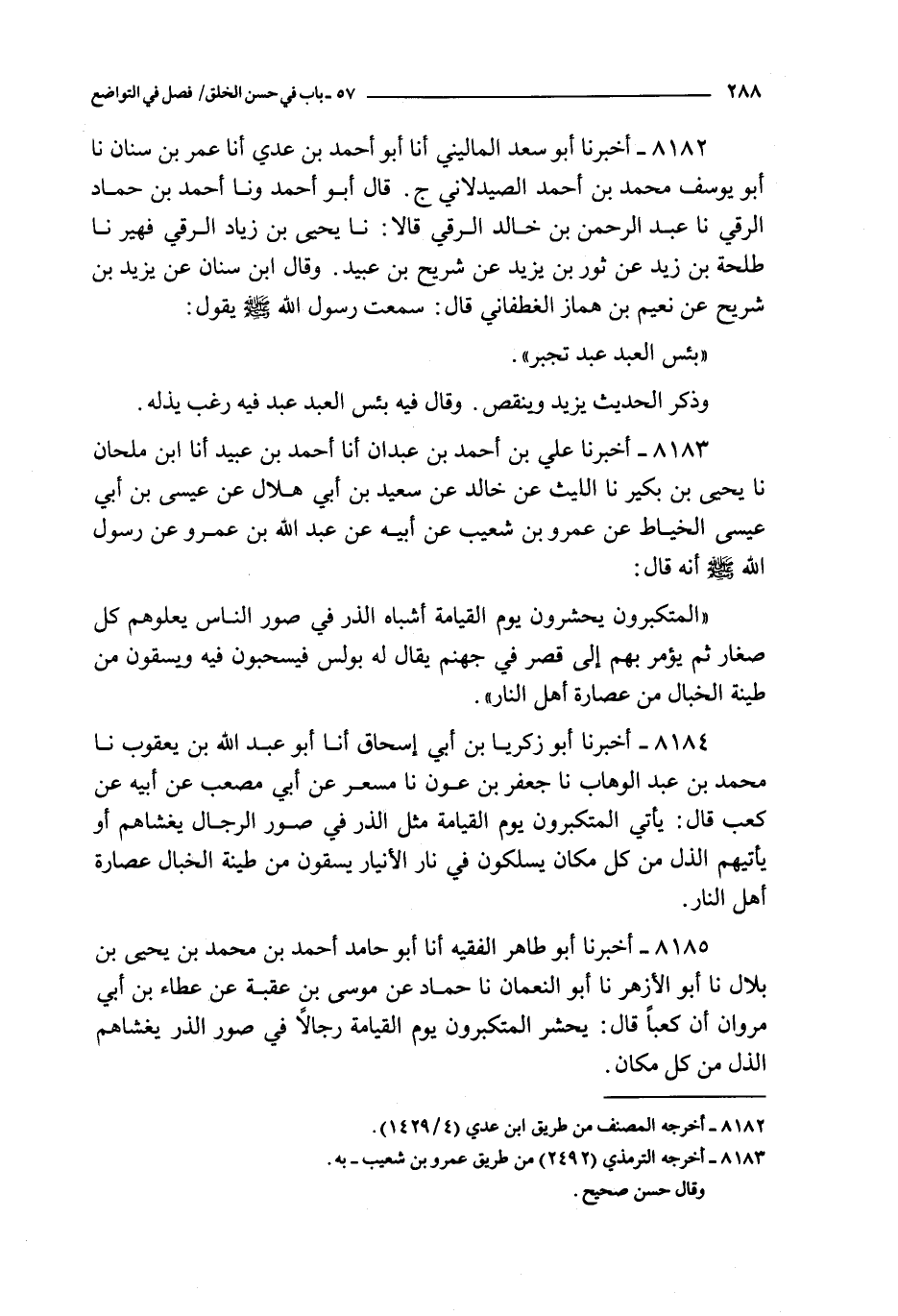 8185 - أخبرنا أبو طاهر الفقيه أنا أبو حامد أحمد بن محمد بن يحيى بن بلال نا أبو الأزهر نا أبو النعمان نا حماد عن موسى بن عقبة عن عطاء بن أبي مروان أن كعبا قال : يحشر المتكبرون يوم القيامة رجالا في صور الذر يغشاهم الذل من كل مكان