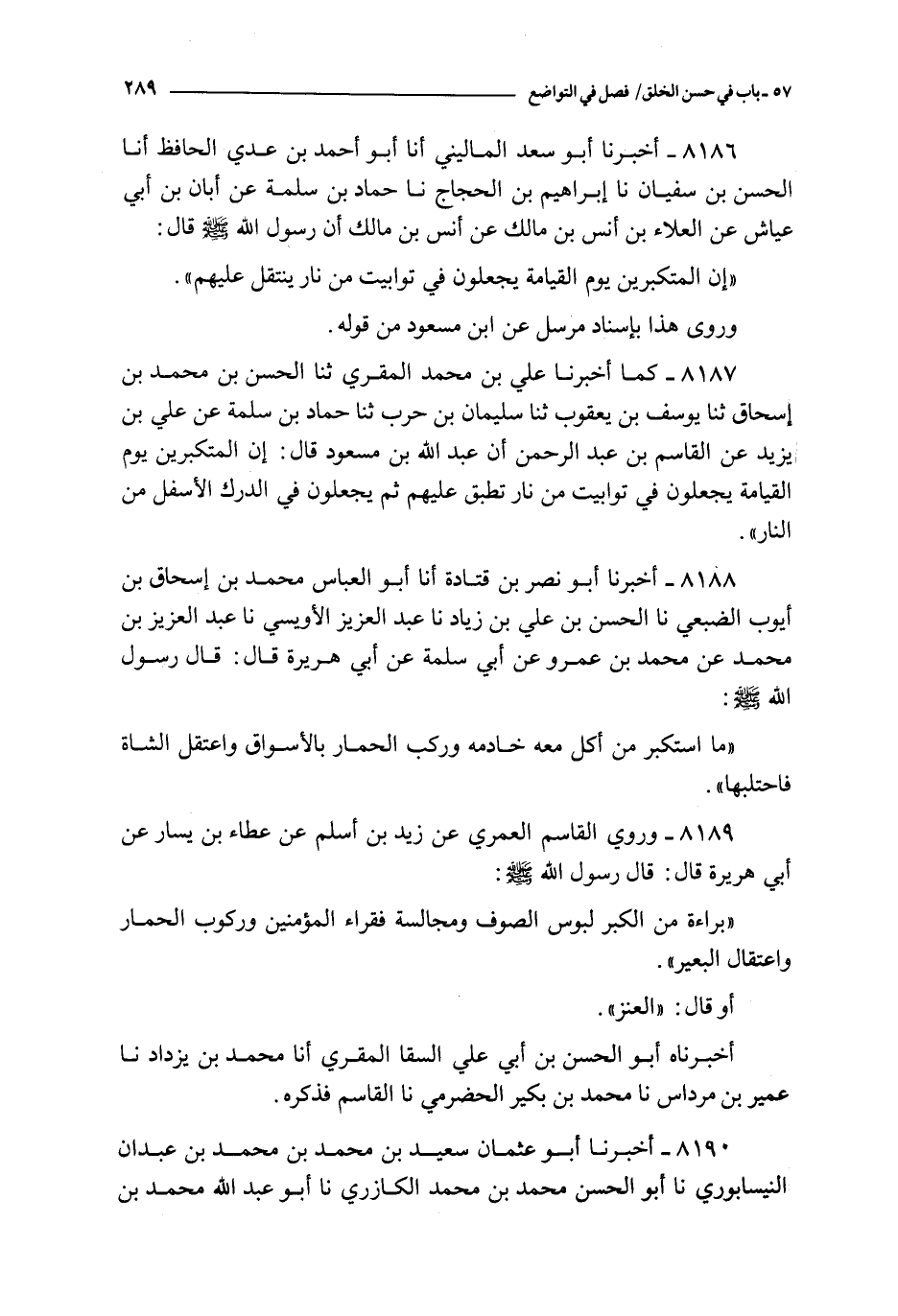 8189 - وروي القاسم العمري عن زيد بن أسلم عن عطاء بن يسار عن أبي هريرة قال : قال رسول الله صلى الله عليه و سلم : براءة من الكبر لبوس الصوف و مجالسة فقراء المؤمنين و ركوب الحمار و اعتقال البعير