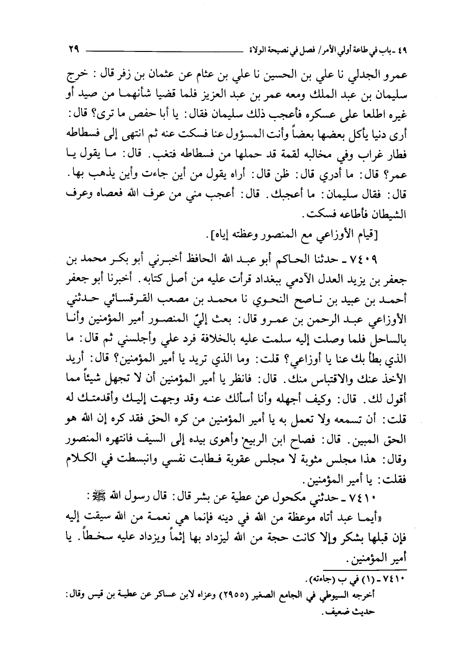 7409 - حدثنا الحاكم أبو عبد الله الحافظ أخبرني أبو بكر محمد بن جعفر بن يزيد العدل الآدمي ببغداد قرأت عليه من أصل كتابه أخبرنا أبو جعفر أحمد بن عبيد بن ناصح النحوي نا محمد بن مصعب القرقسائي حدثني الأوزاعي عبد الرحمن بن عمرو قال : بعث إلي المنصور أمير المؤمنين و أنا بالساحل فلما وصلت إليه سلمت عليه بالخلافة فرد علي و أجلسني ثم قال : ما الذي بطأ بك عنا يا أوزاعي ؟ قلت : و ما الذي تريد يا أمير المؤمنين ؟ قال : أريد الأخذ عنك و الاقتباس منك قال : فانظر يا أمير المؤمنين أن لا تجهل شيئا مما أقول لك قال : و كيف أجهله و أنا أسألك عنه و قد وجهت إليك و أقدمتك له قلت : أن تسمعه و لا تعمل به يا أمير المؤمنين من كره الحق فقد كره إن الله هو الحق المبين قال : فصاح ابن الربيع و أهوى بيده إلى السيف فانتهره المنصور و قال : هذا مجلس مثوبة لا مجلس عقوبة فطابت نفسي و انبسطت في الكلام فقلت : يا أمير المؤمنين