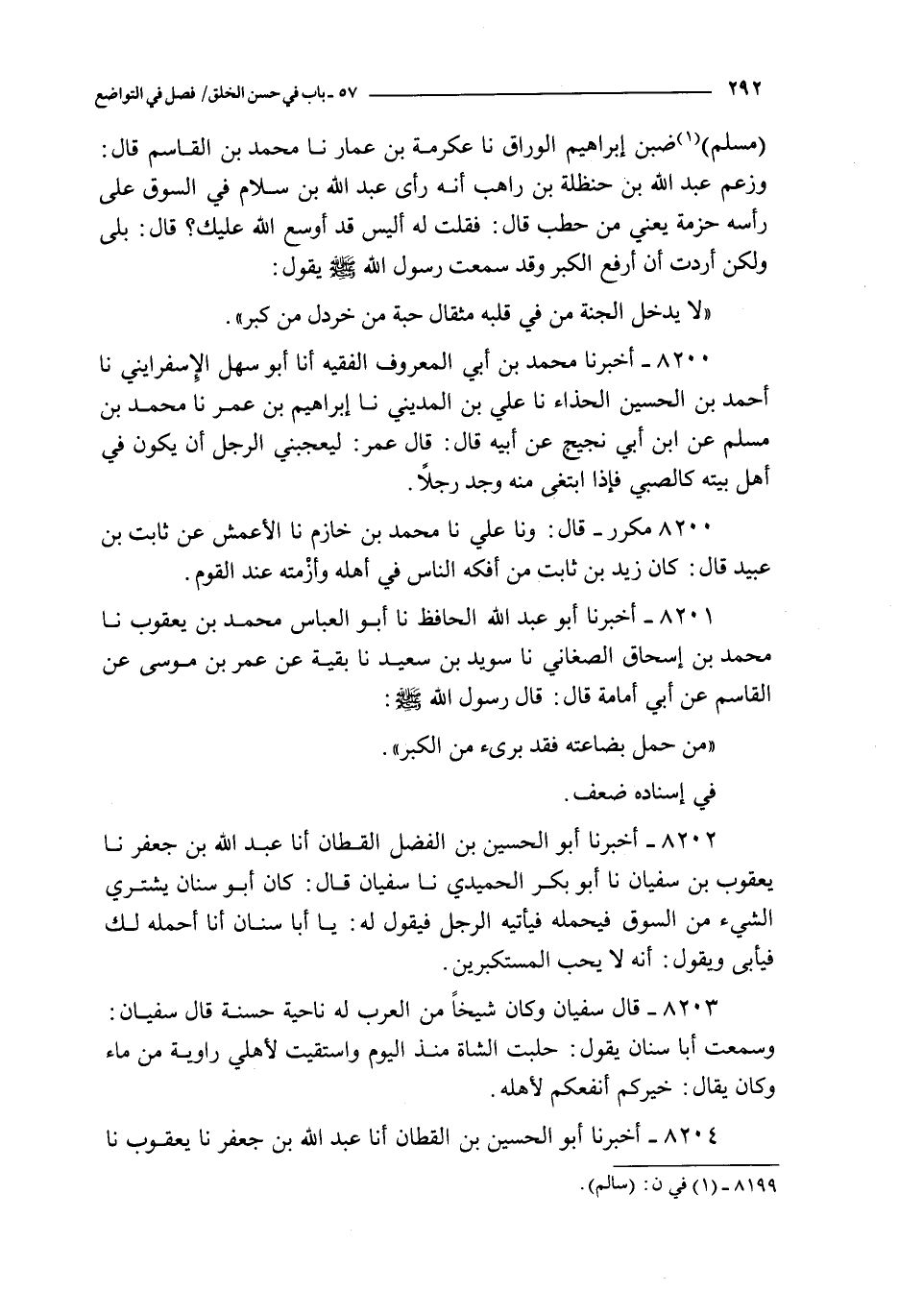 8202 - أخبرنا أبو الحسين بن الفضل القطان أنا عبد الله بن جعفر نا يعقوب بن سفيان نا أبو بكر الحميدي نا سفيان قال : كان أبو سنان يشتري الشيء من السوق فيحمله فيأتيه الرجل فيقول له : يا أبا سنان أنا أحمله لك فيأبى و يقول : أنه لا يحب المستكبرين