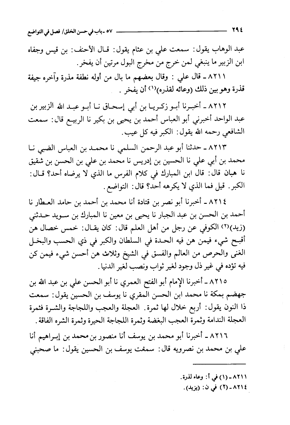 8213 - حدثنا أبو عبد الرحمن السلمي نا محمد بن العباس الضبي نا محمد بن أبي علي نا الحسين بن إدريس نا محمد بن علي بن الحسن بن شقيق نا هبان قال : قال ابن المبارك في كلام الفرس ما الذي لا يرضاه أحد ؟ قال : الكبر قيل فما الذي لا يكرهه أحد ؟ قال : التواضع