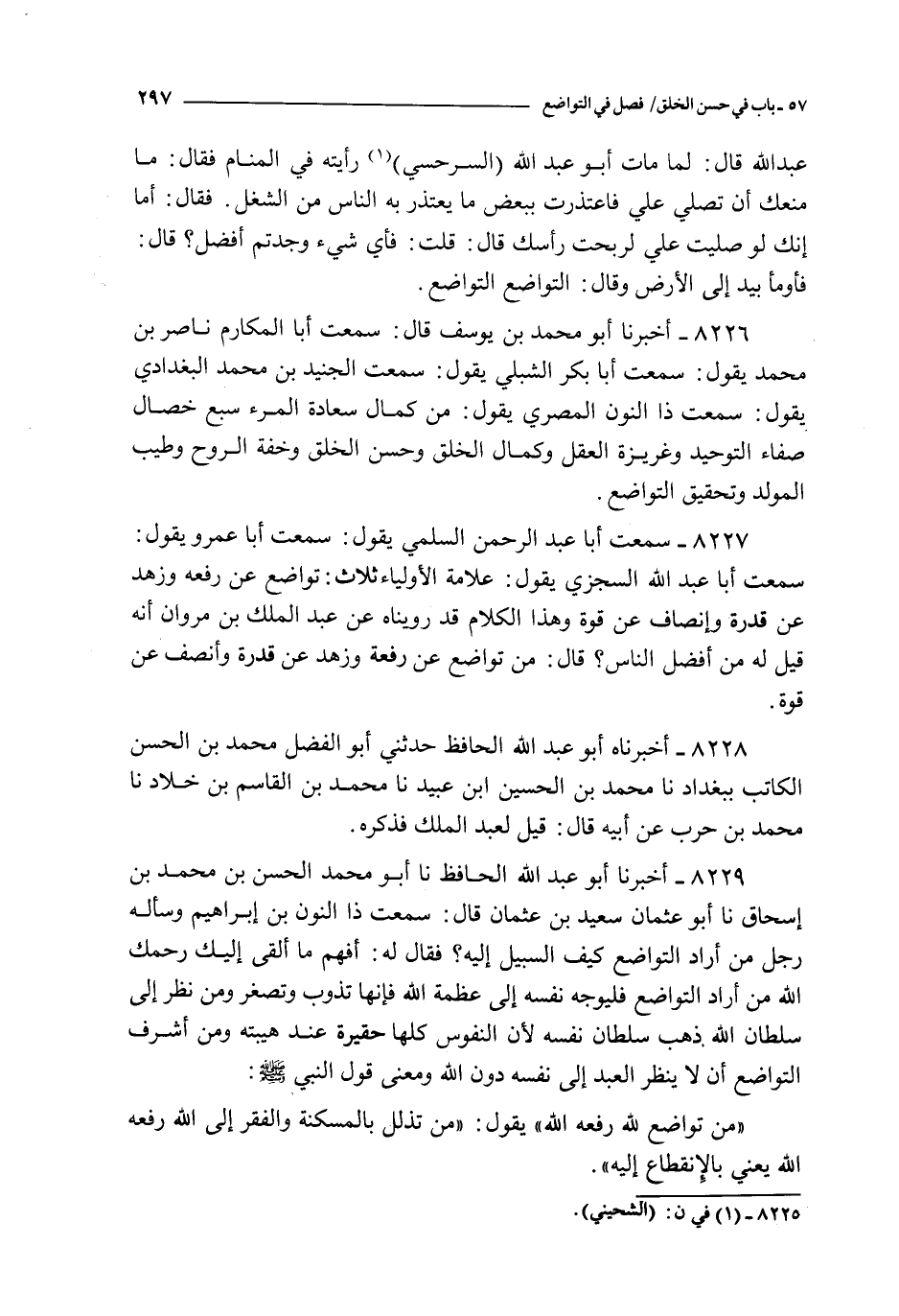 8226 - أخبرنا أبو محمد بن يوسف قال : سمعت أبا المكارم ناصر بن محمد يقول : سمعت أبا بكر الشبلي يقول : سمعت الجنيد بن محمد اليغدادي يقول : سمعت ذا النون المصري يقول : من كمال سعادة المرء سبع خصال صفاء التوحيد و غريزة العقل وكمال الخلق وحسن الخلق و خفة الروح وطيب المولد وتحقيق التواضع