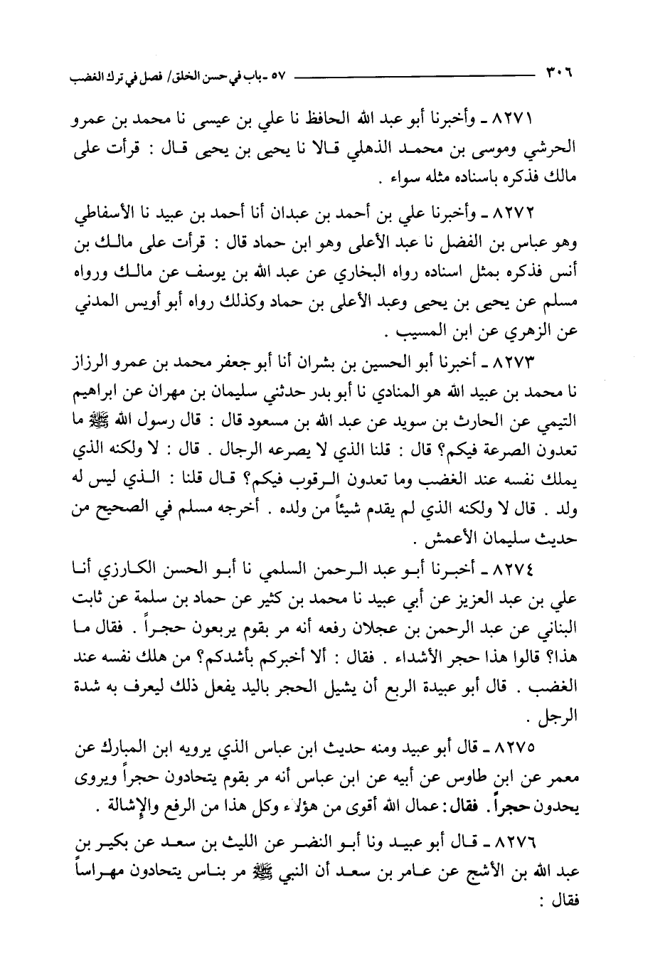 8274 - أخبرنا أبو عبد الرحمن السلمي نا أبو الحسن الكارزي أنا علي بن عبد العزيز عن أبي عبيد نا محمد بن كثير عن حماد بن سلمة عن ثابت البناني عن عبد الرحمن بن عجلان رفعه : أنه مر بقوم يربعون حجرا فقال ما هذا ؟ قالوا هذا حجر الأشداء فقال : ألا أخبركم بأشدكم ؟ من هلك نفسه عند الغضب قال أبو عبيدة الربع أن يشيل الحجر باليد يفعل ذلك ليعرف به شدة الرجل